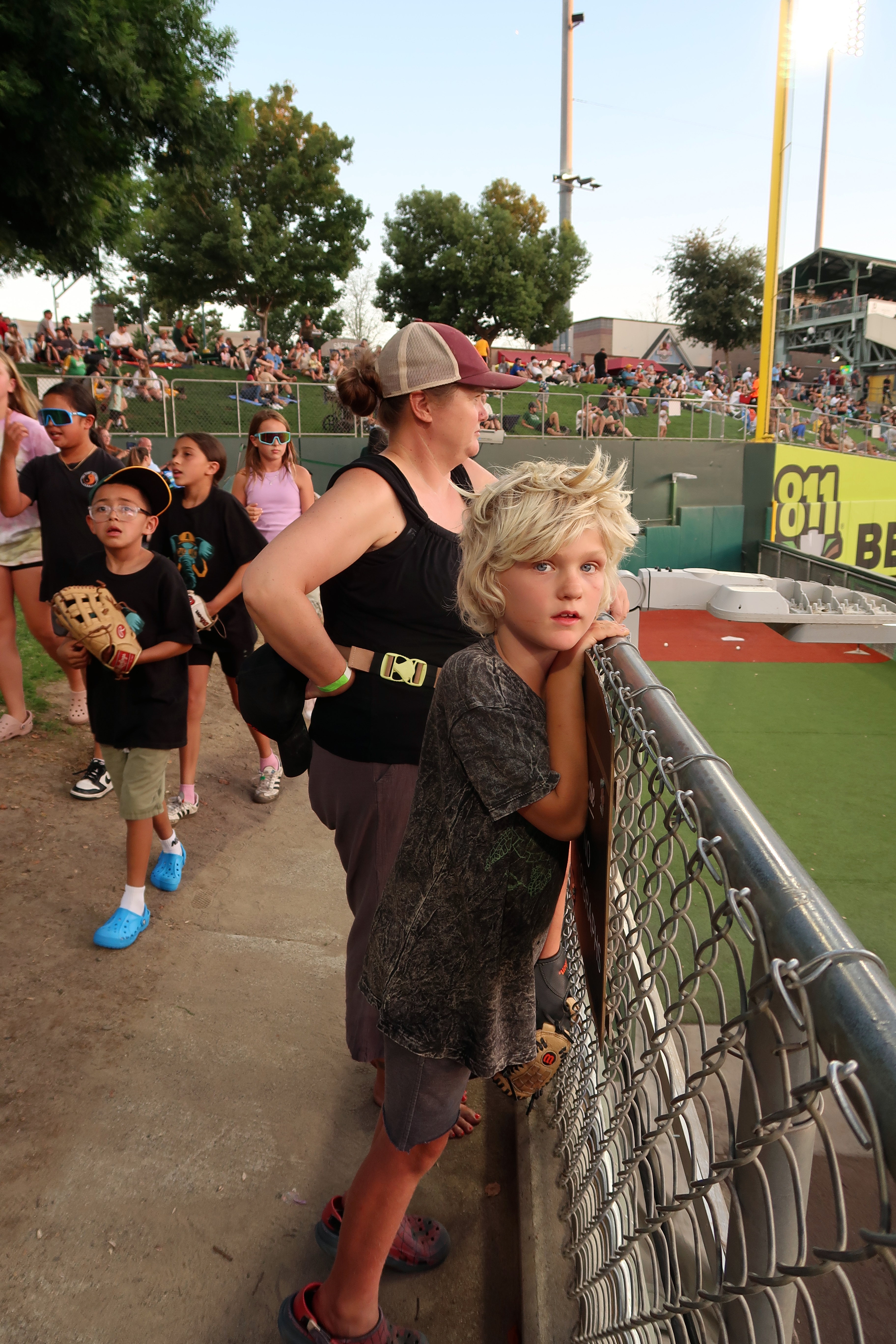 Morgan, Maggie, and Leo at a professional baseball game. 2025-08-02