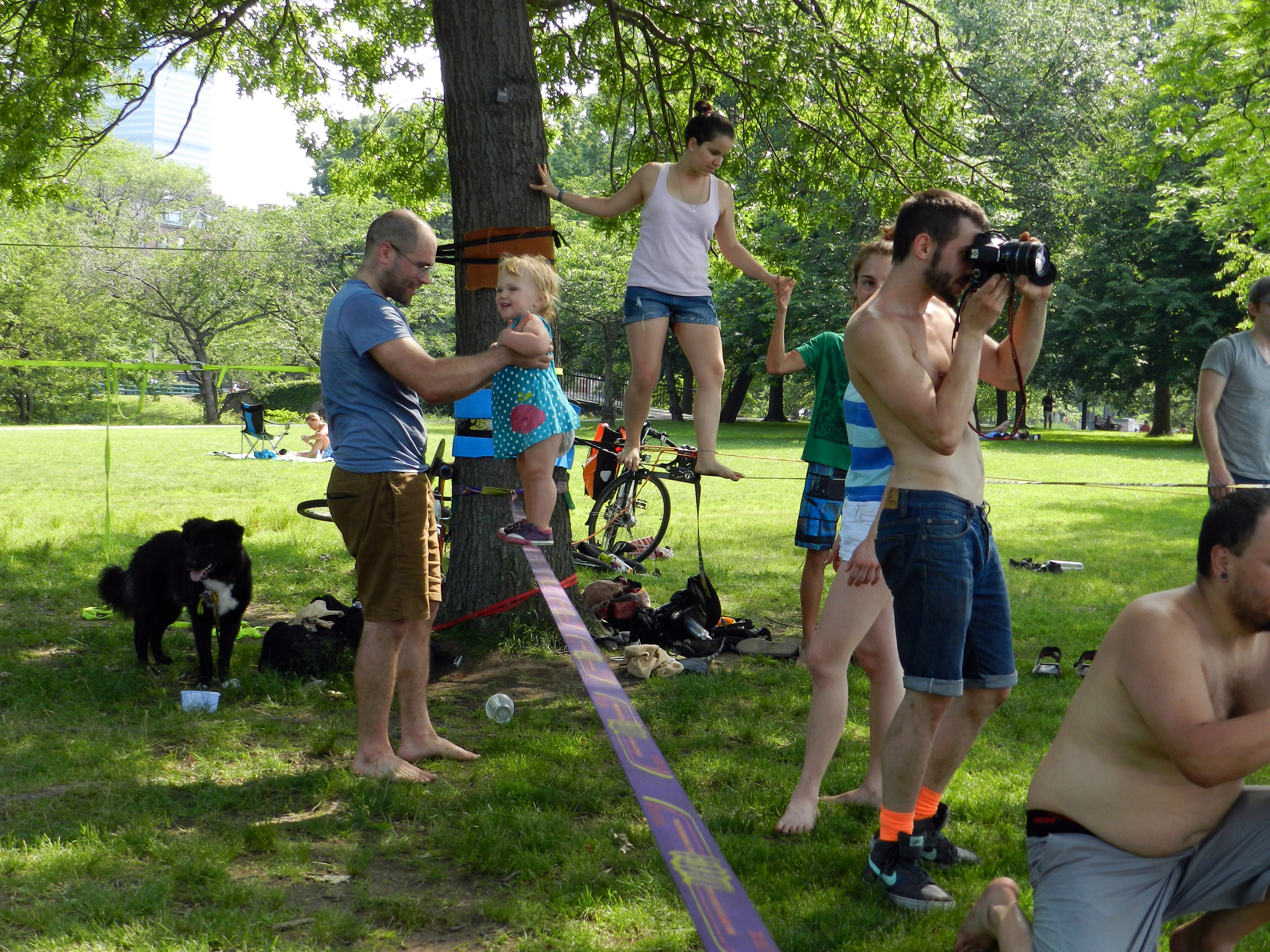 Adrian and Margo slacklining at the Charles River esplanade. Марго ходит по канату. 2013-06-23