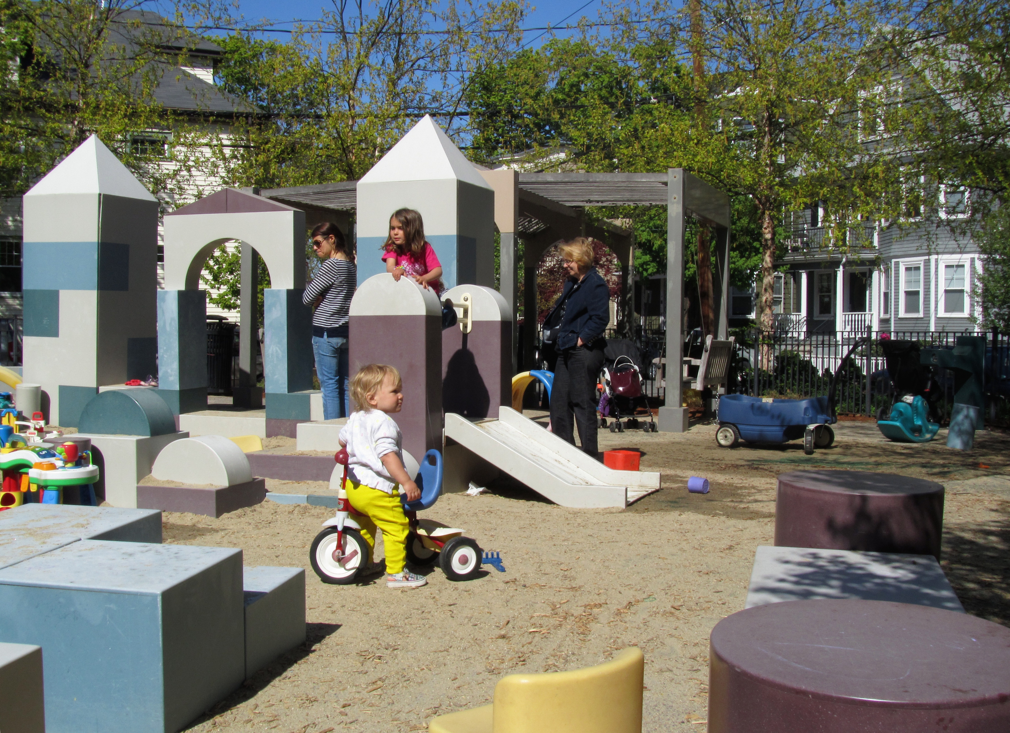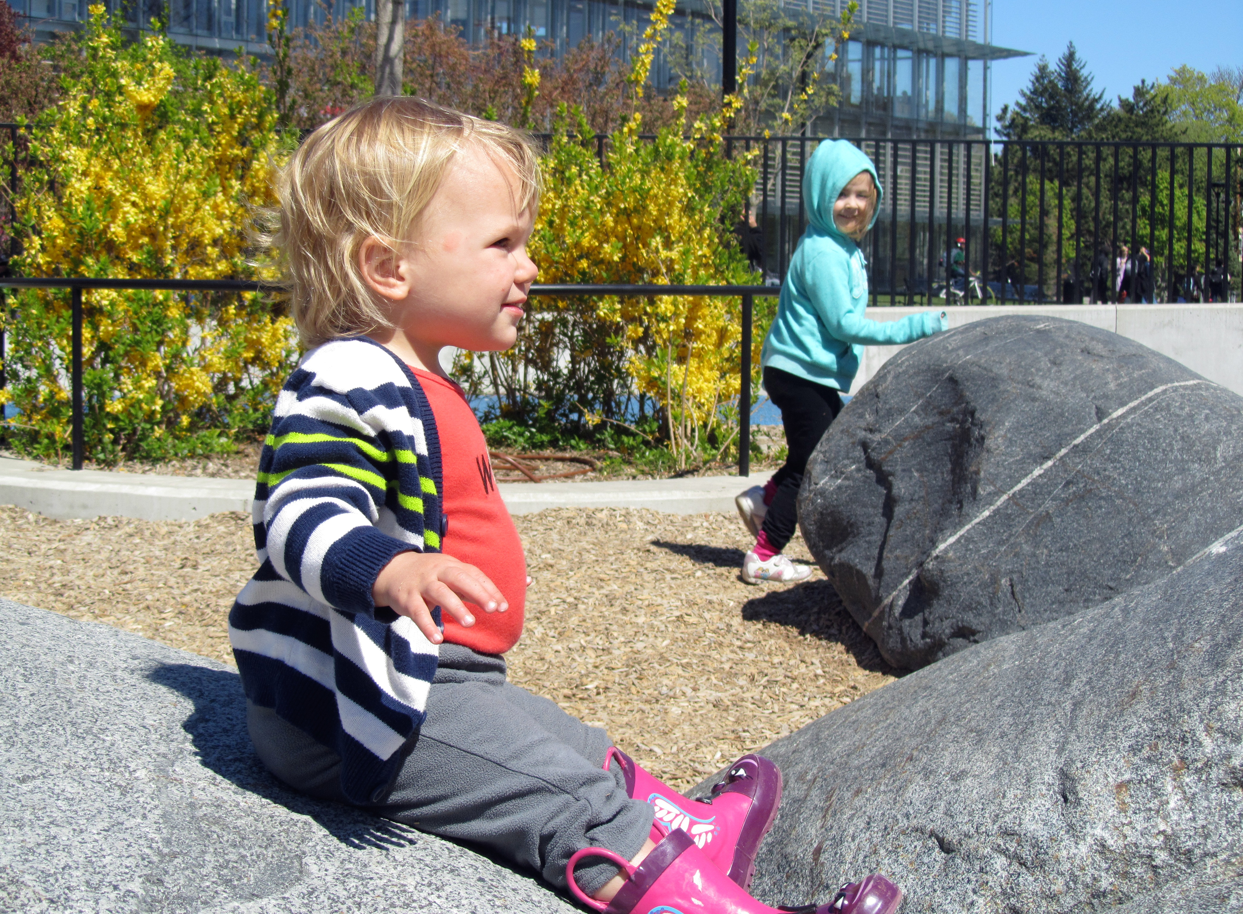 Margo on a rock at the Cambridge Library playground. 2013-05-03