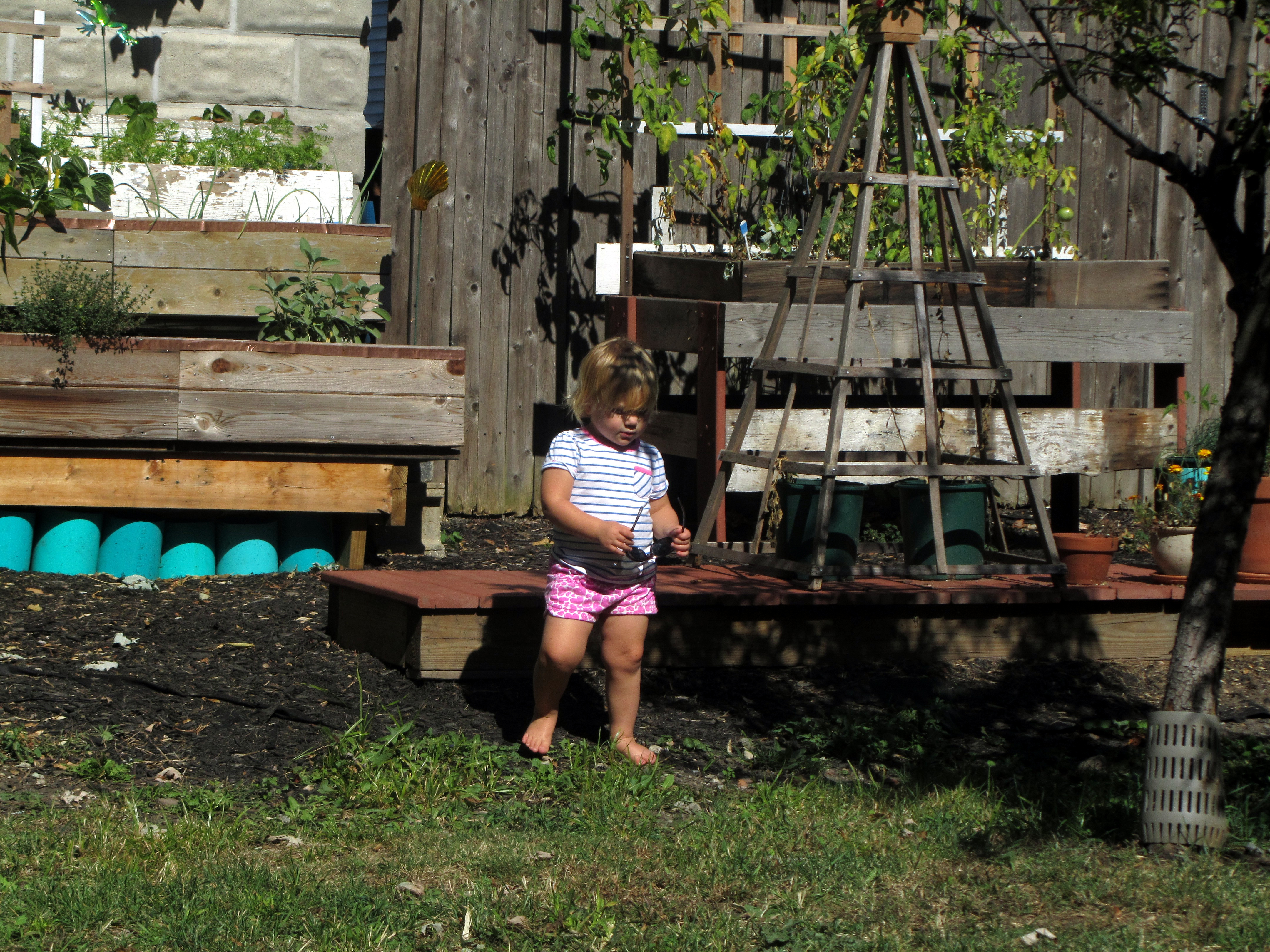 Margo inspects a herb garden next to the bike path. Рита нашла огород рядом с велосипедной дорожкой.