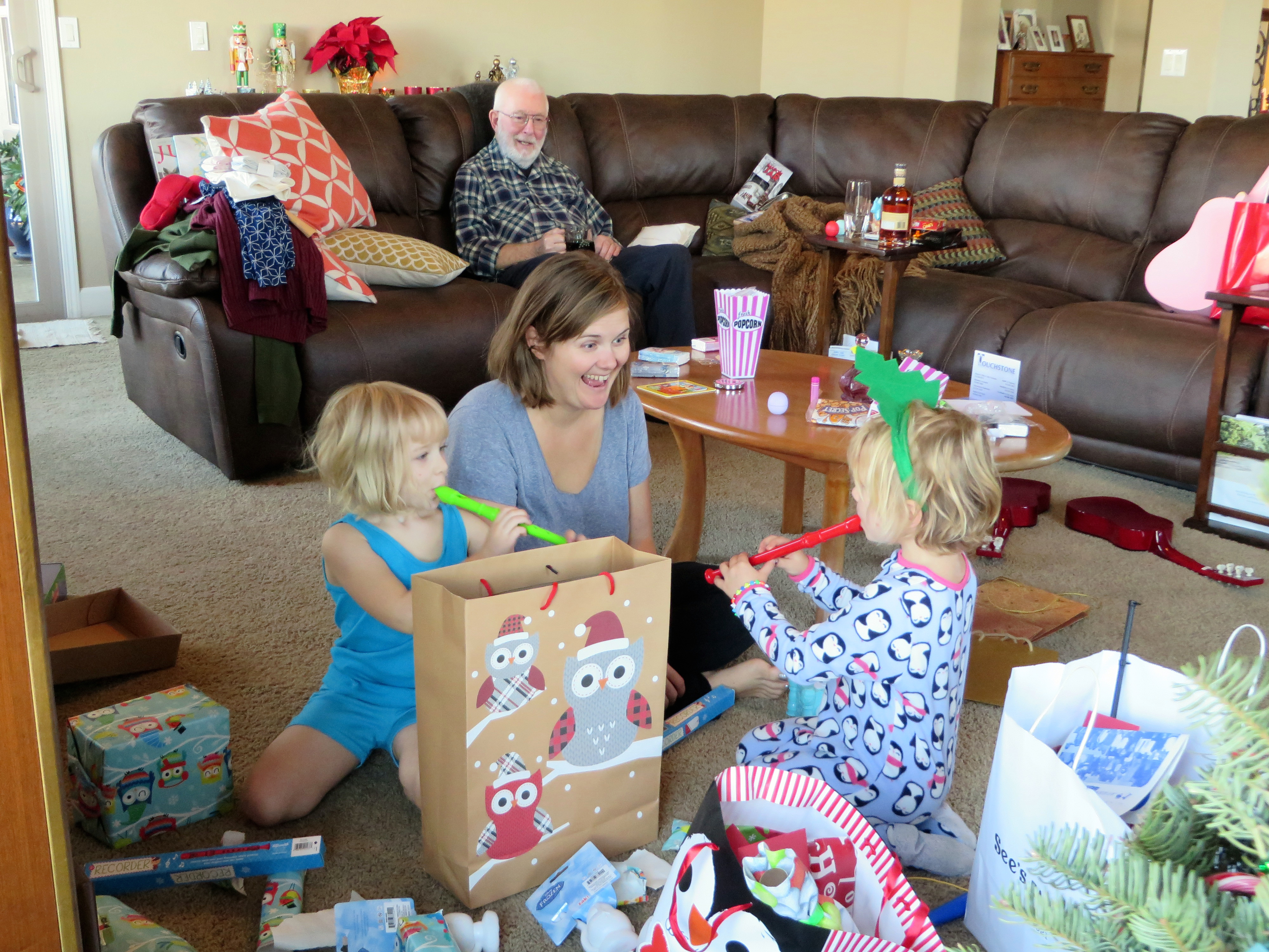 Cassie, Morgan, and Margo unwrapping xmas presents under the watchful eye of grandpa Les. Кэси, Морган, и Марго разворачивают рождественские подарки. 2015-12-25