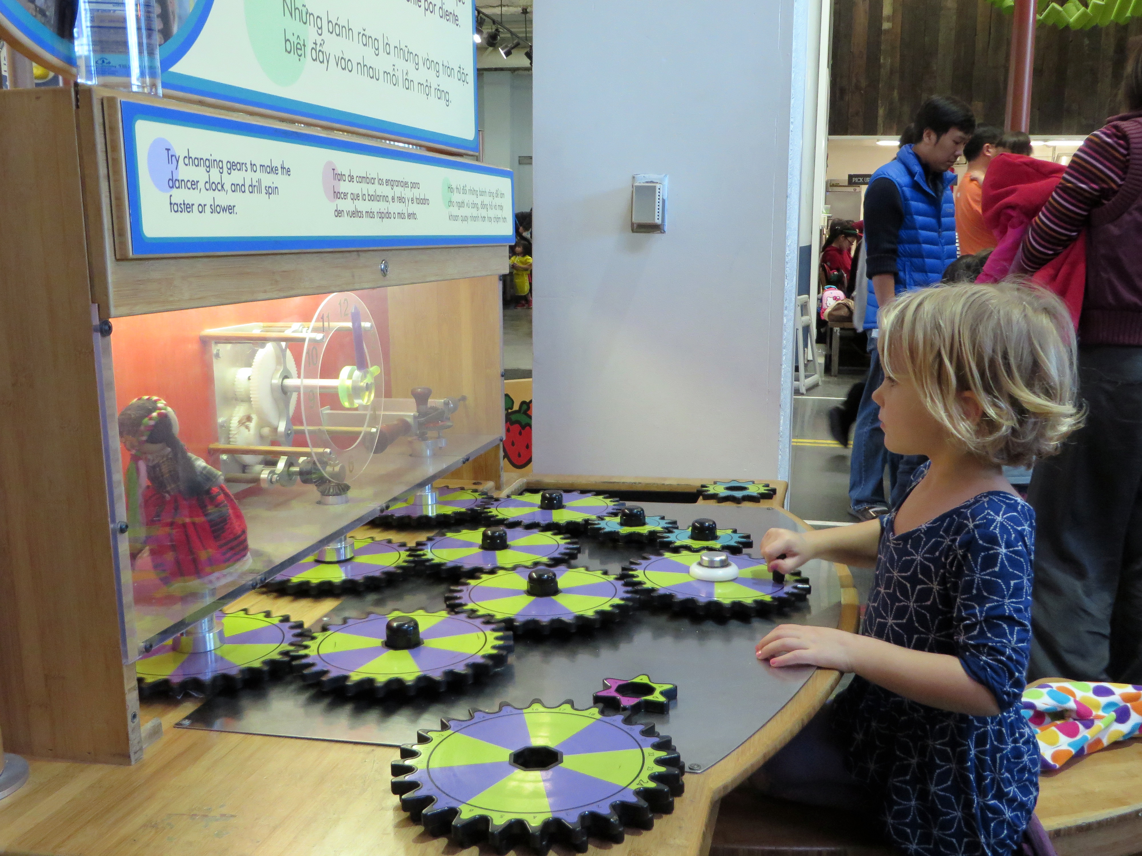 Margo playing with gears in the San Jose Children Discovery Museum. Марго играет с шестерёнками в музее. 2015-12-31