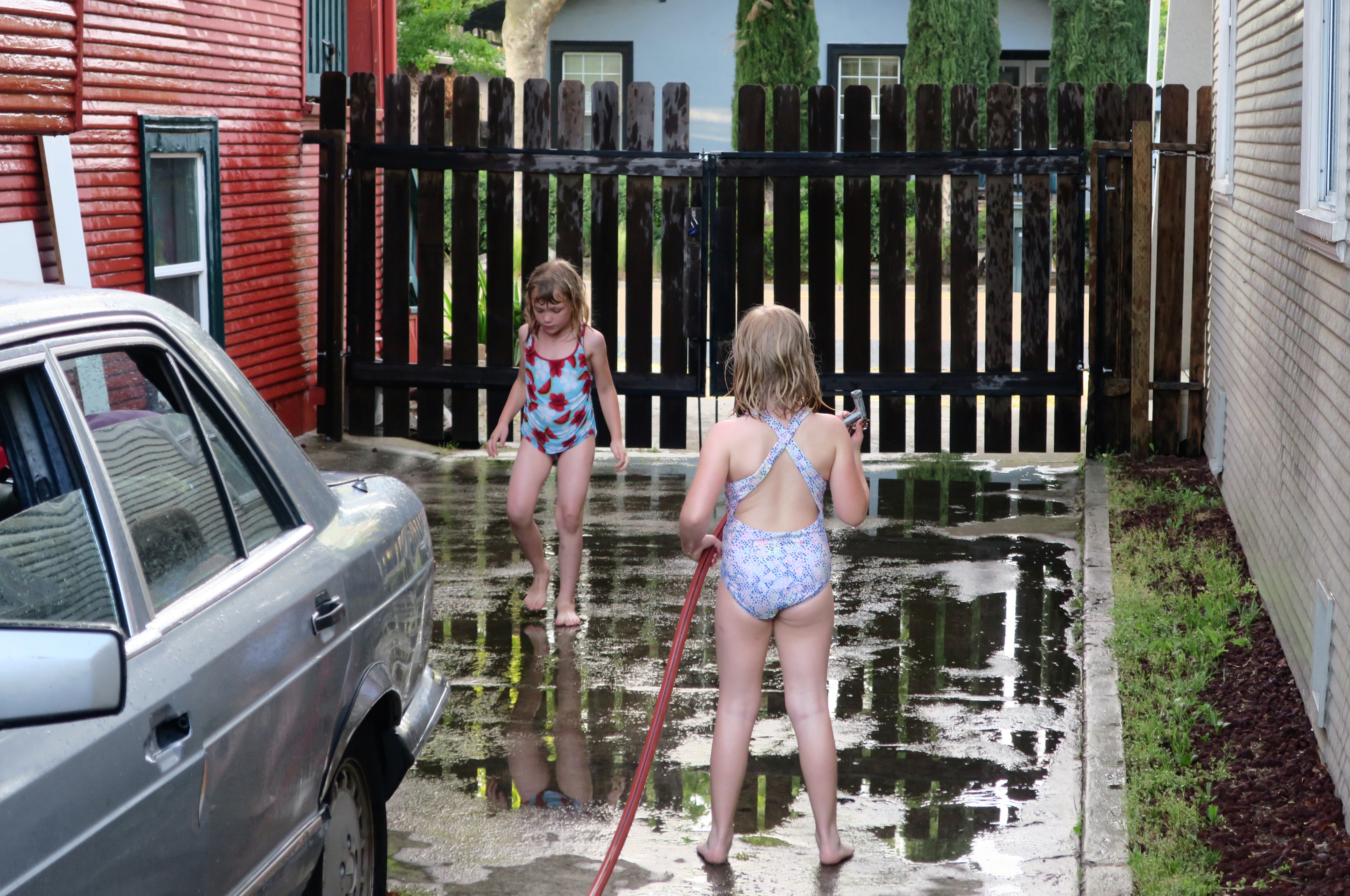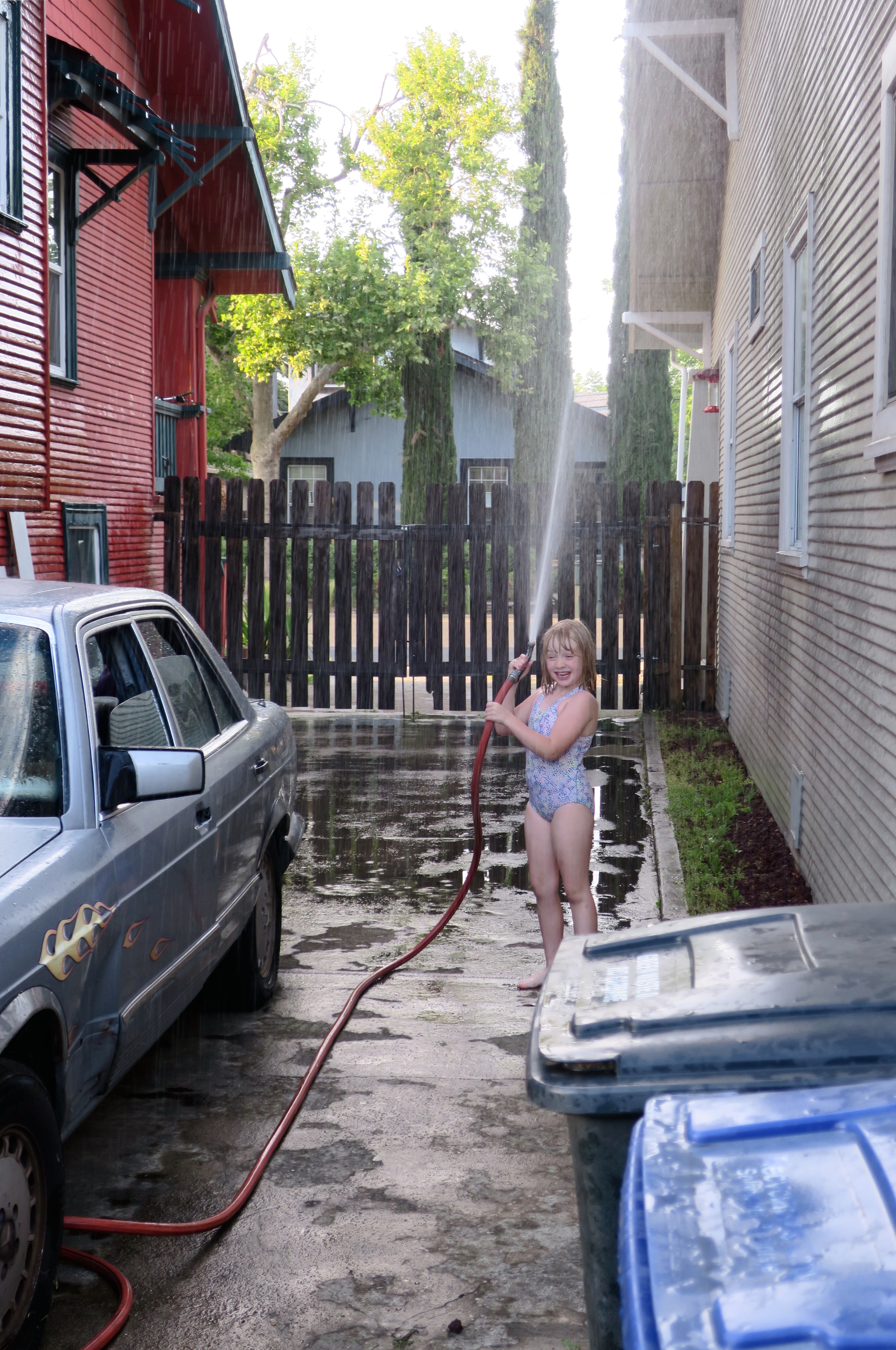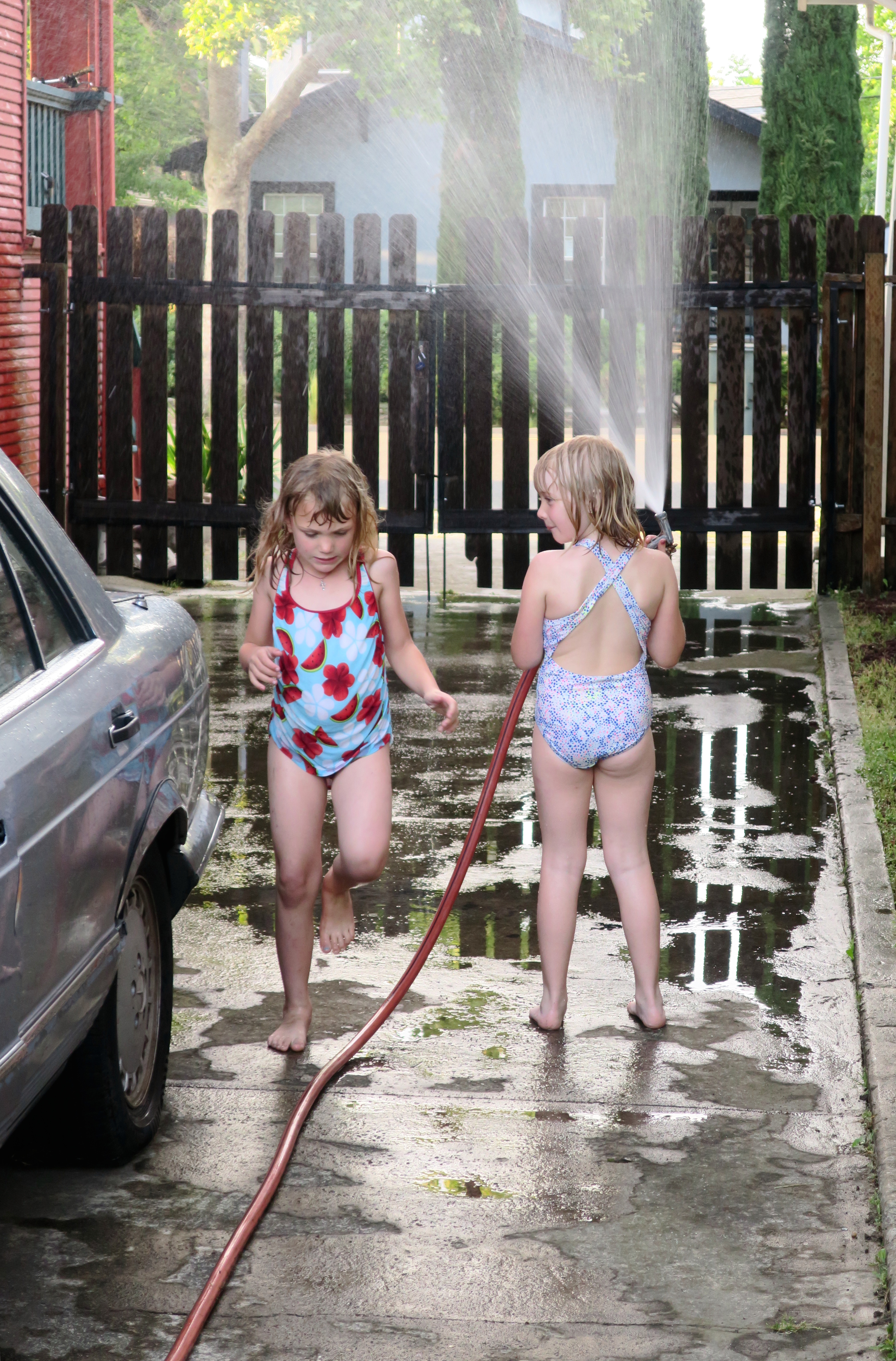 Margo and Cassie playing with water hose in the back. Марго и Кэси играют с водяным шлангом на задах. 2018-05-05