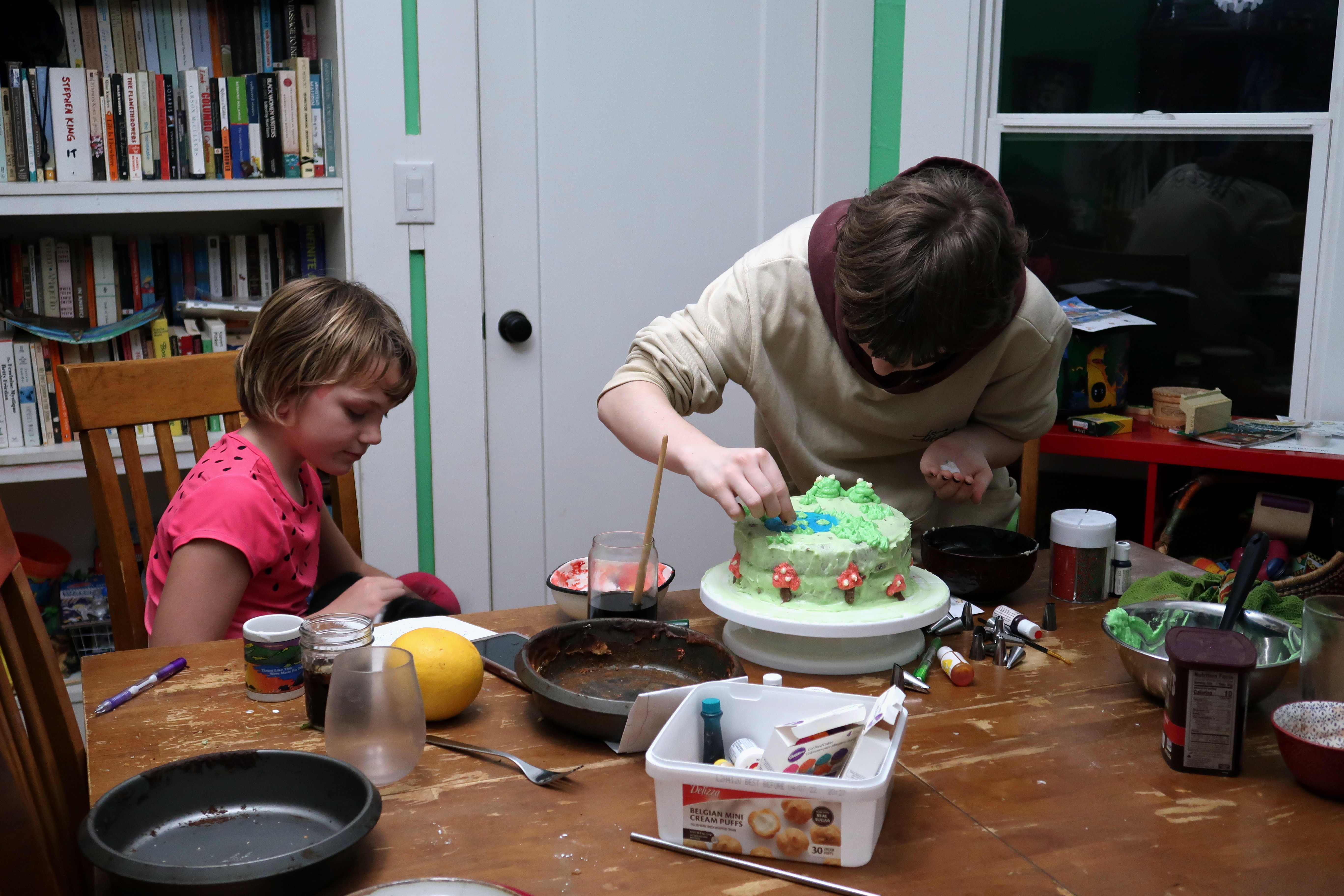 Maggy and Daphne are finishing a frog cake. 2021-01-29