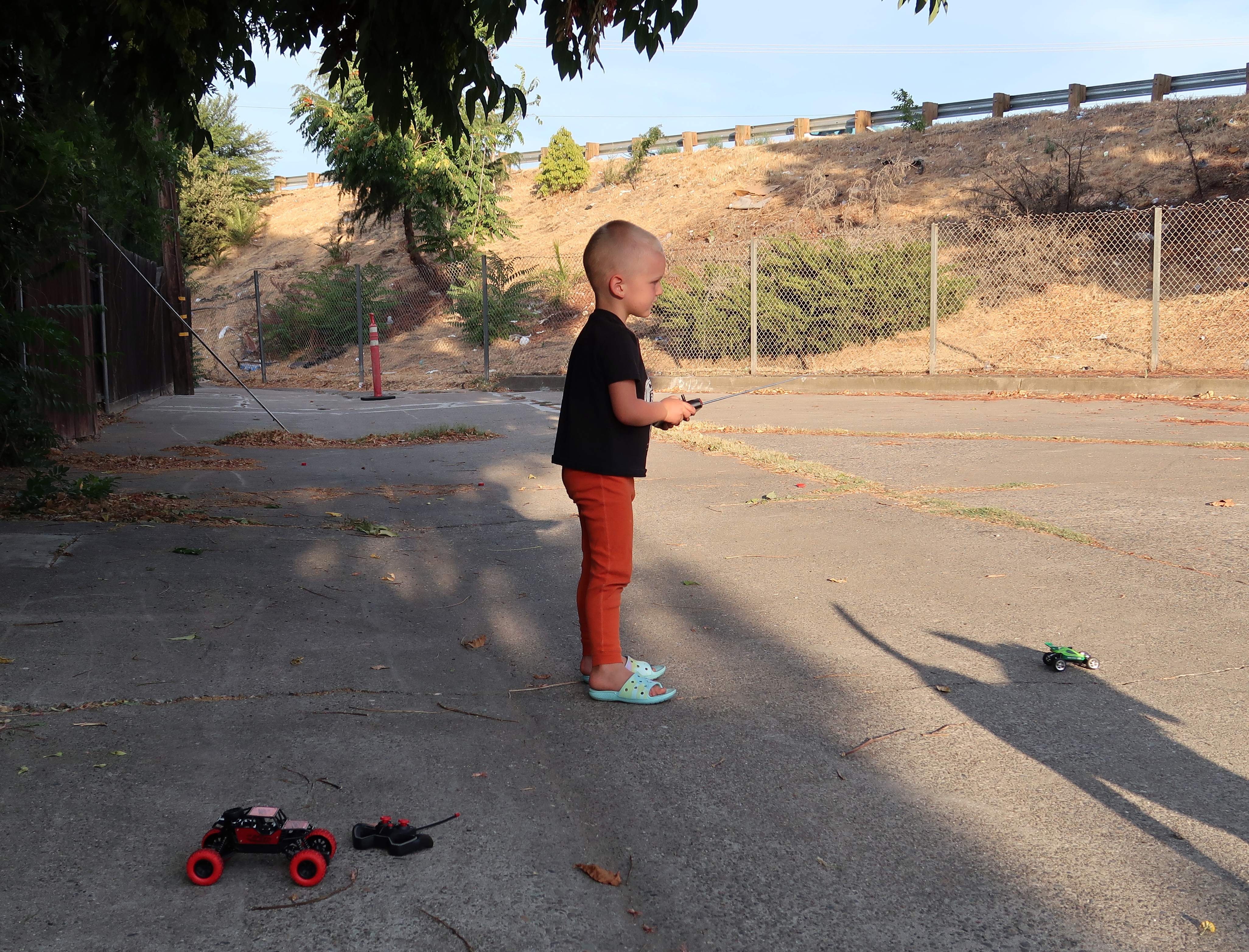 Leo is playing remote-controlled cars in the back alley. Лёва играет в машинки на задах. 2021-06-28