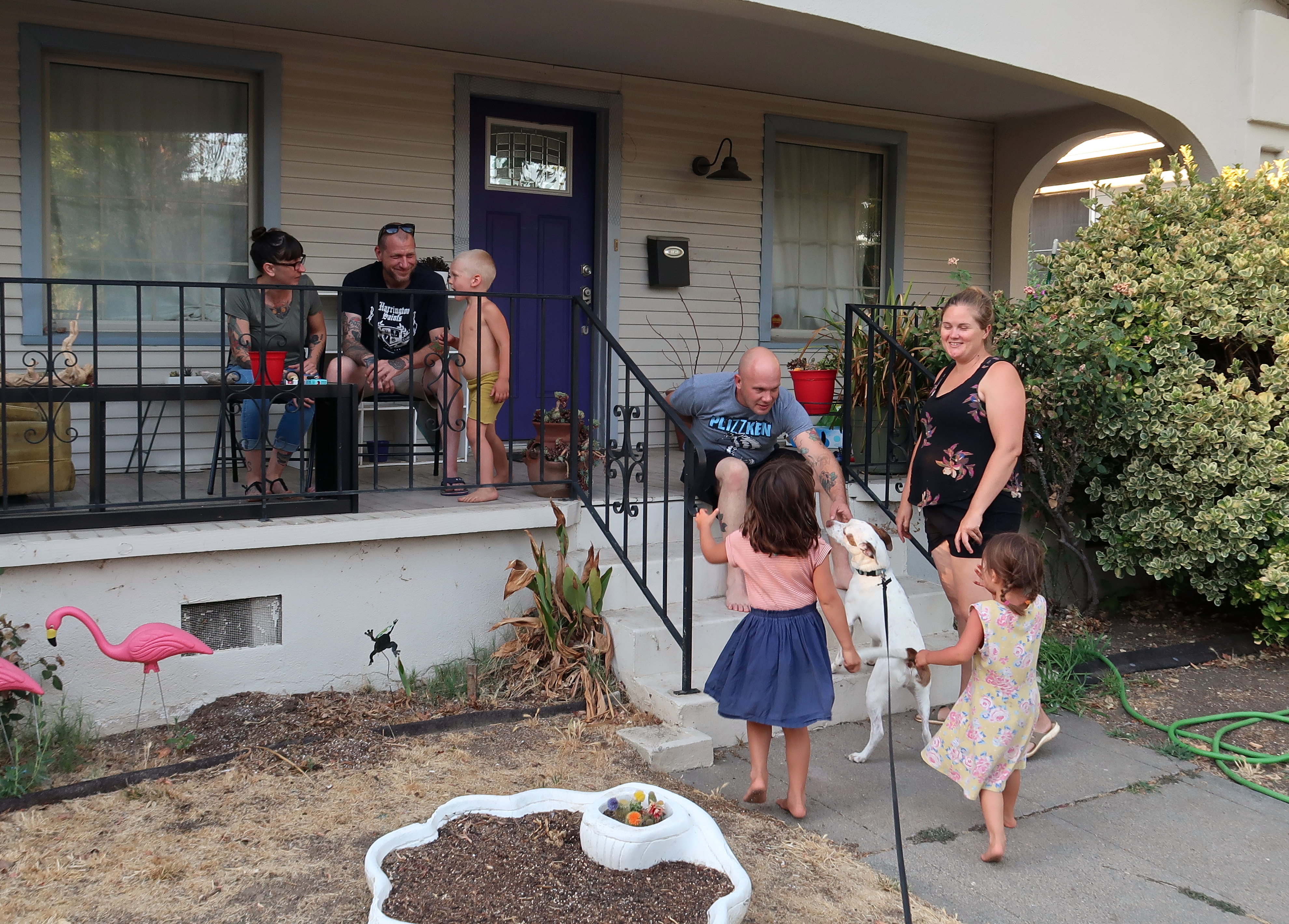 Megan, Eric, Leo, Luke, Mila, Cheetah, Morgan, and Phoebe at Ashton's porch. 2021-06-30