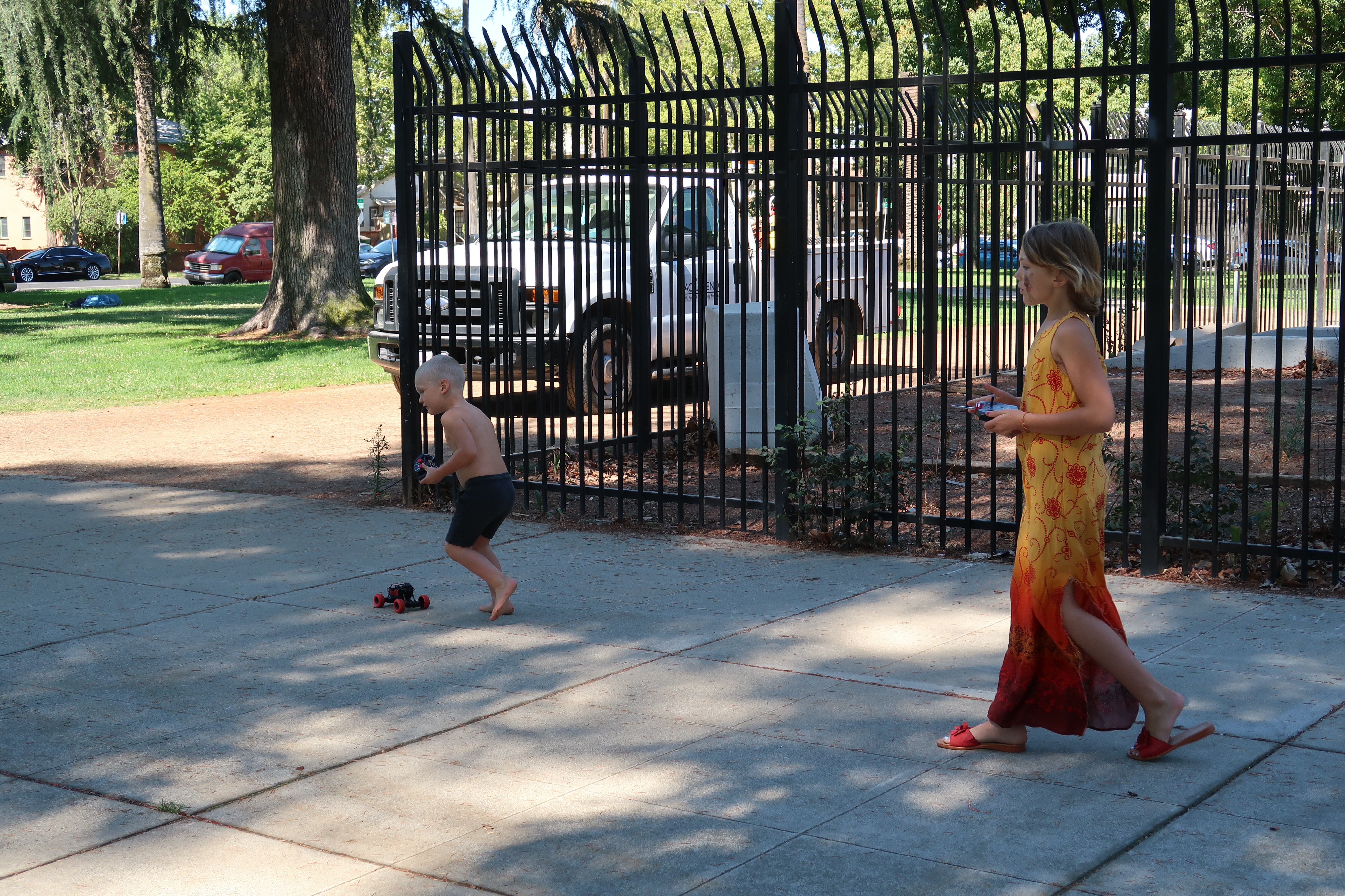 Leo and Maggy playing cars at Wynn park. 2021-07-07