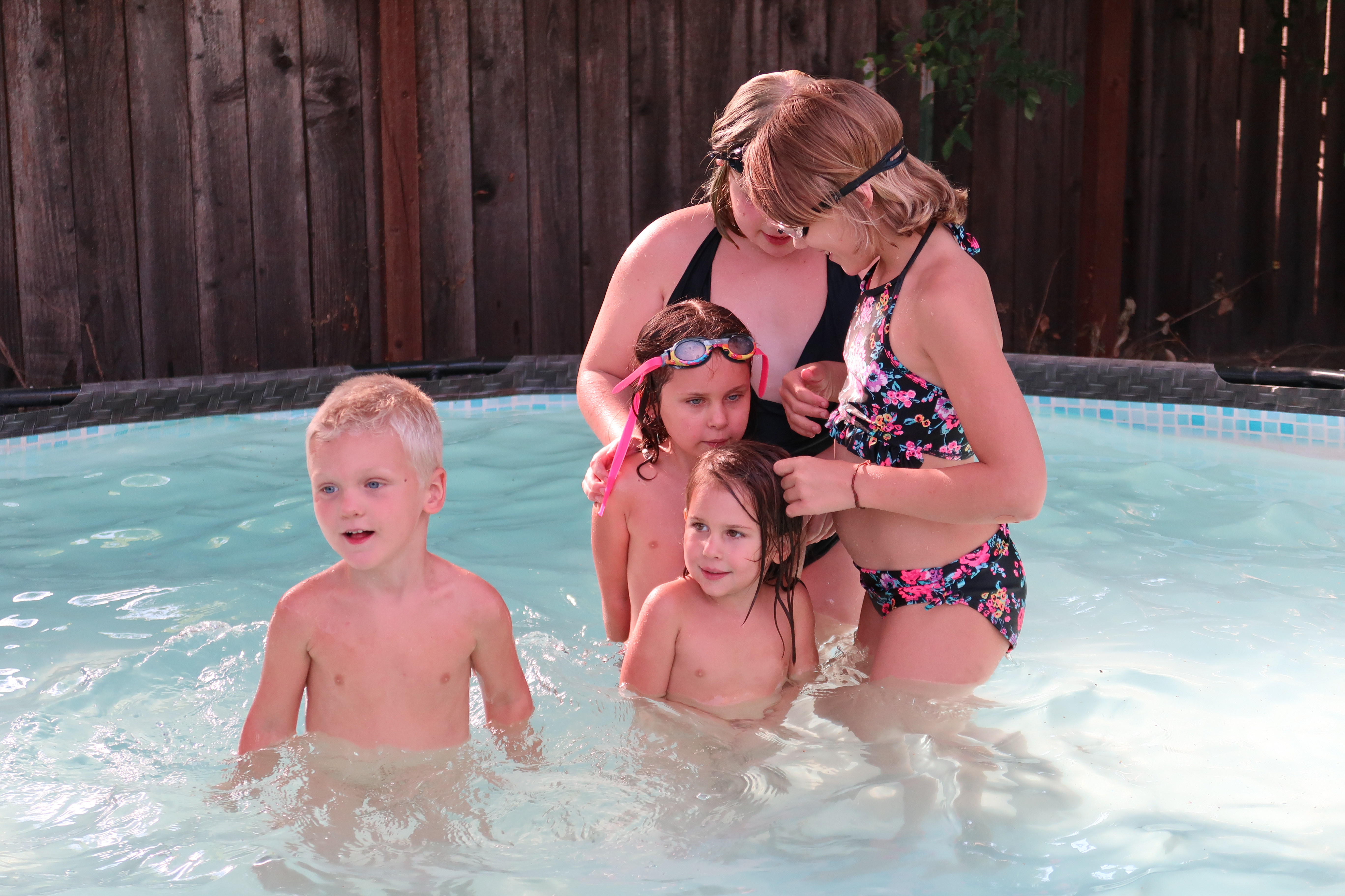 Phoebe, Mila, Cassie, Leo, and Maggy in Rodeo's pool. 2021-07-27