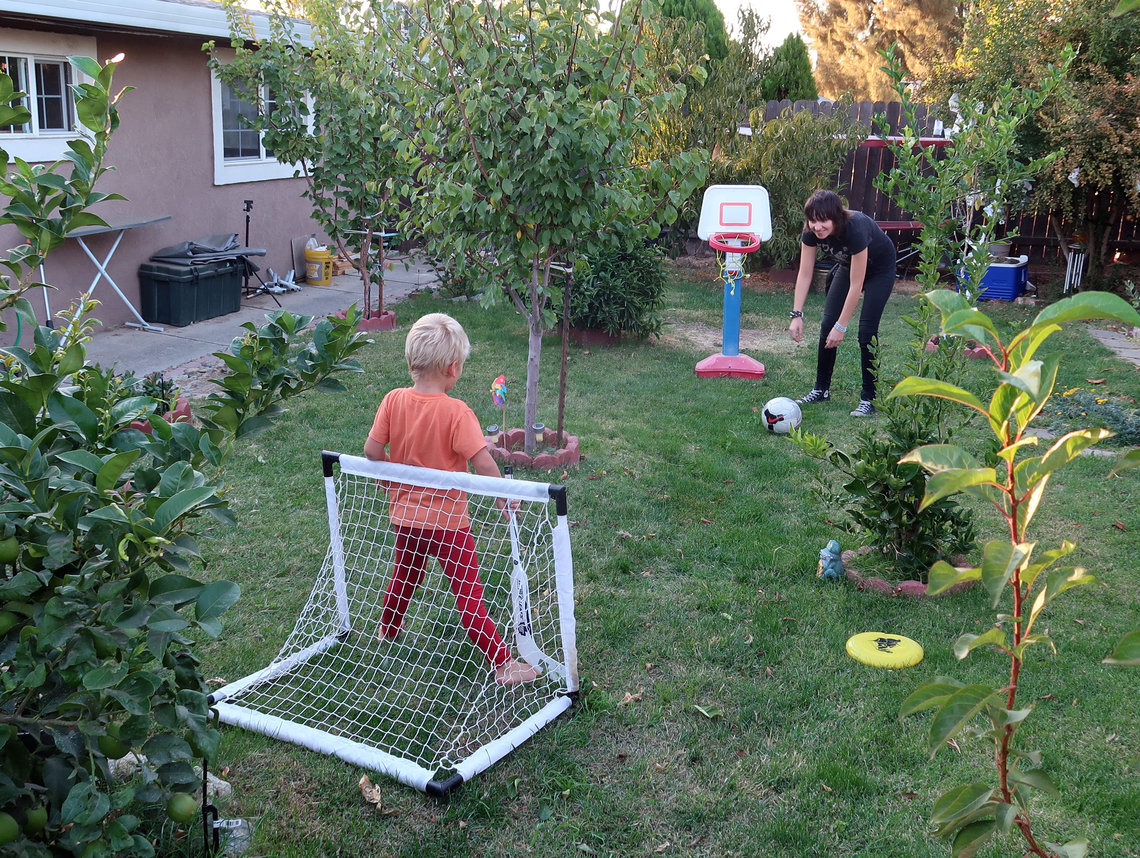 Enza, BMO, and Maggy in the back yard. На заднем дворе. 2021-10-02
