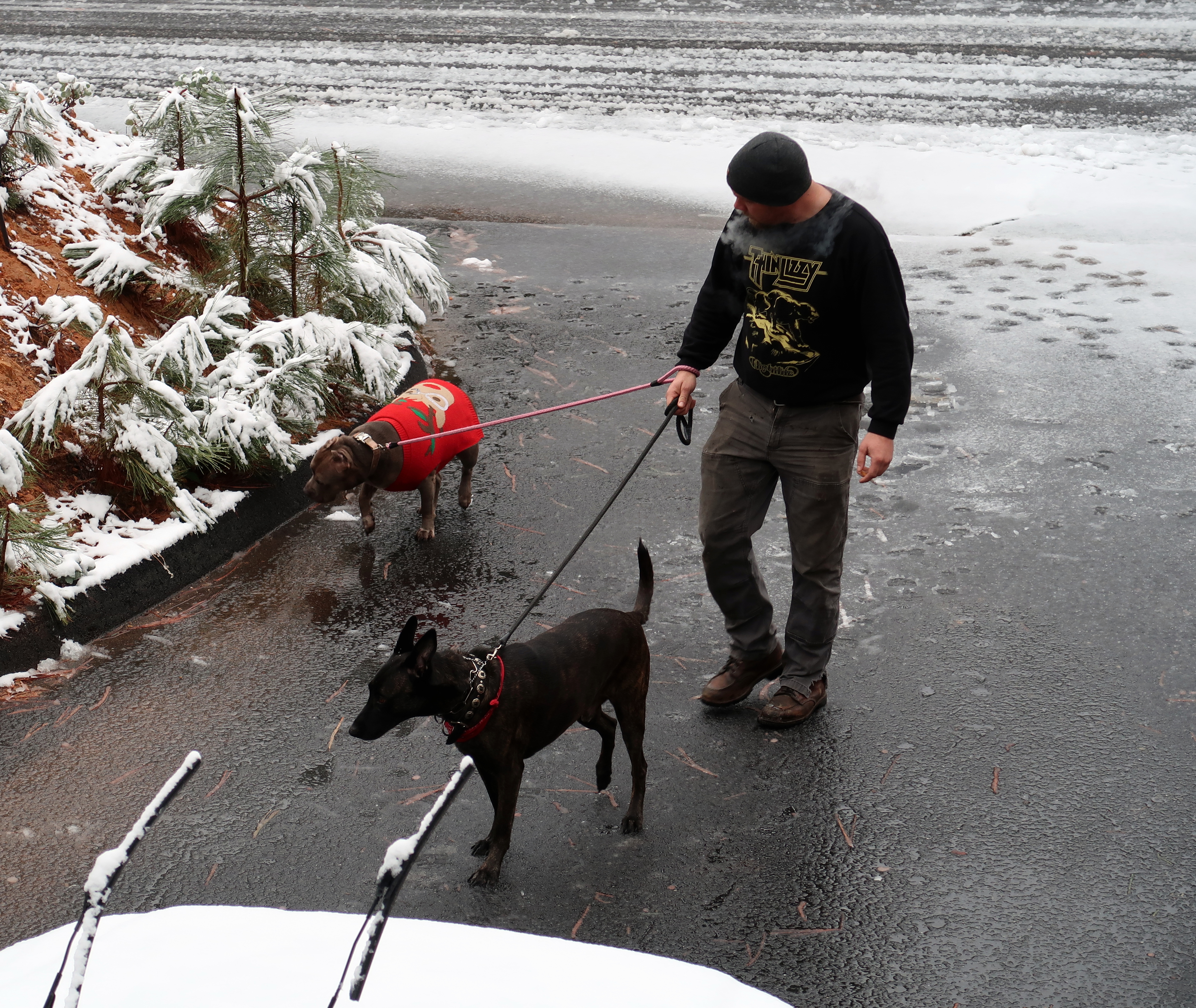 Luke walking with Lily and Zeppelin. 2021-12-25