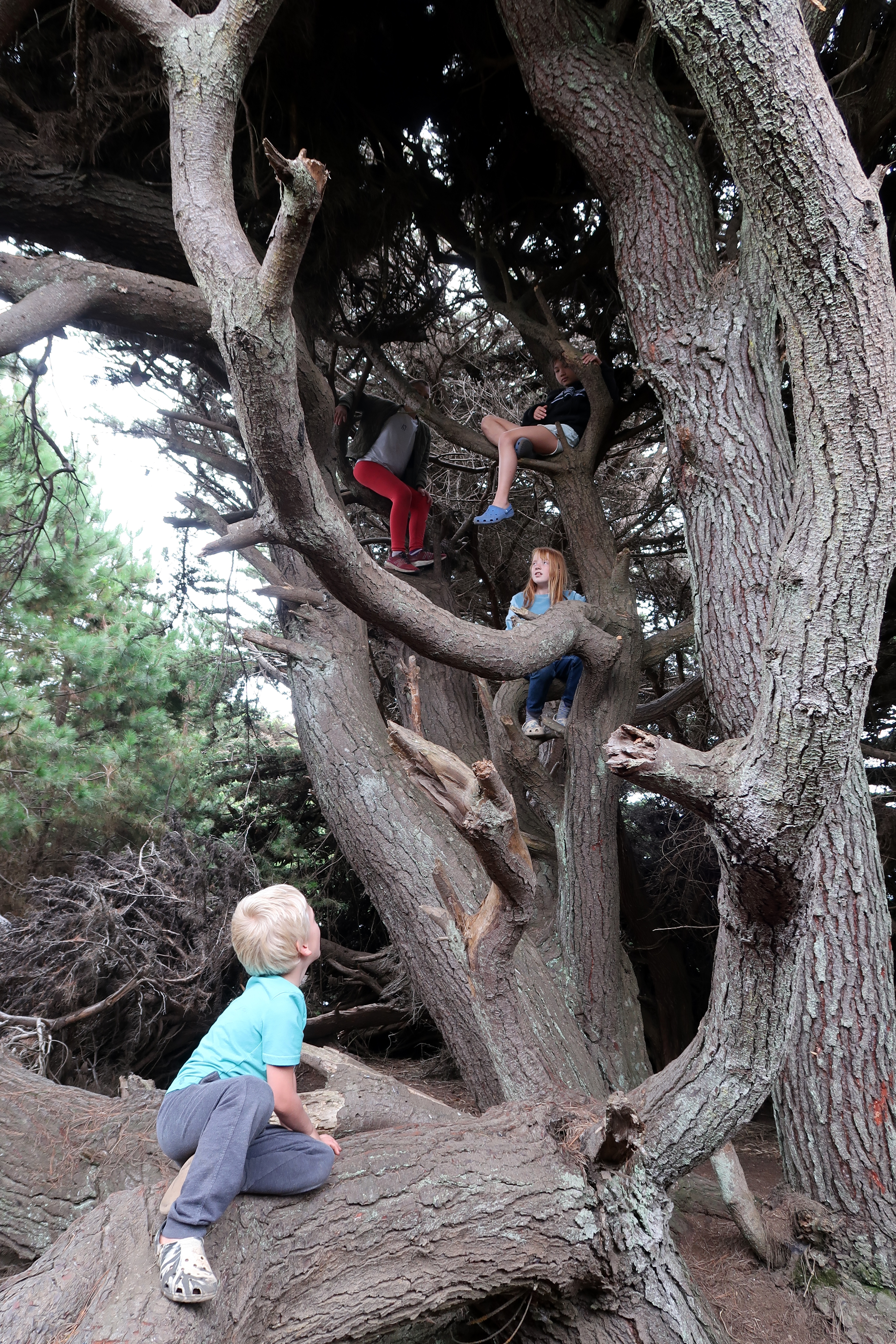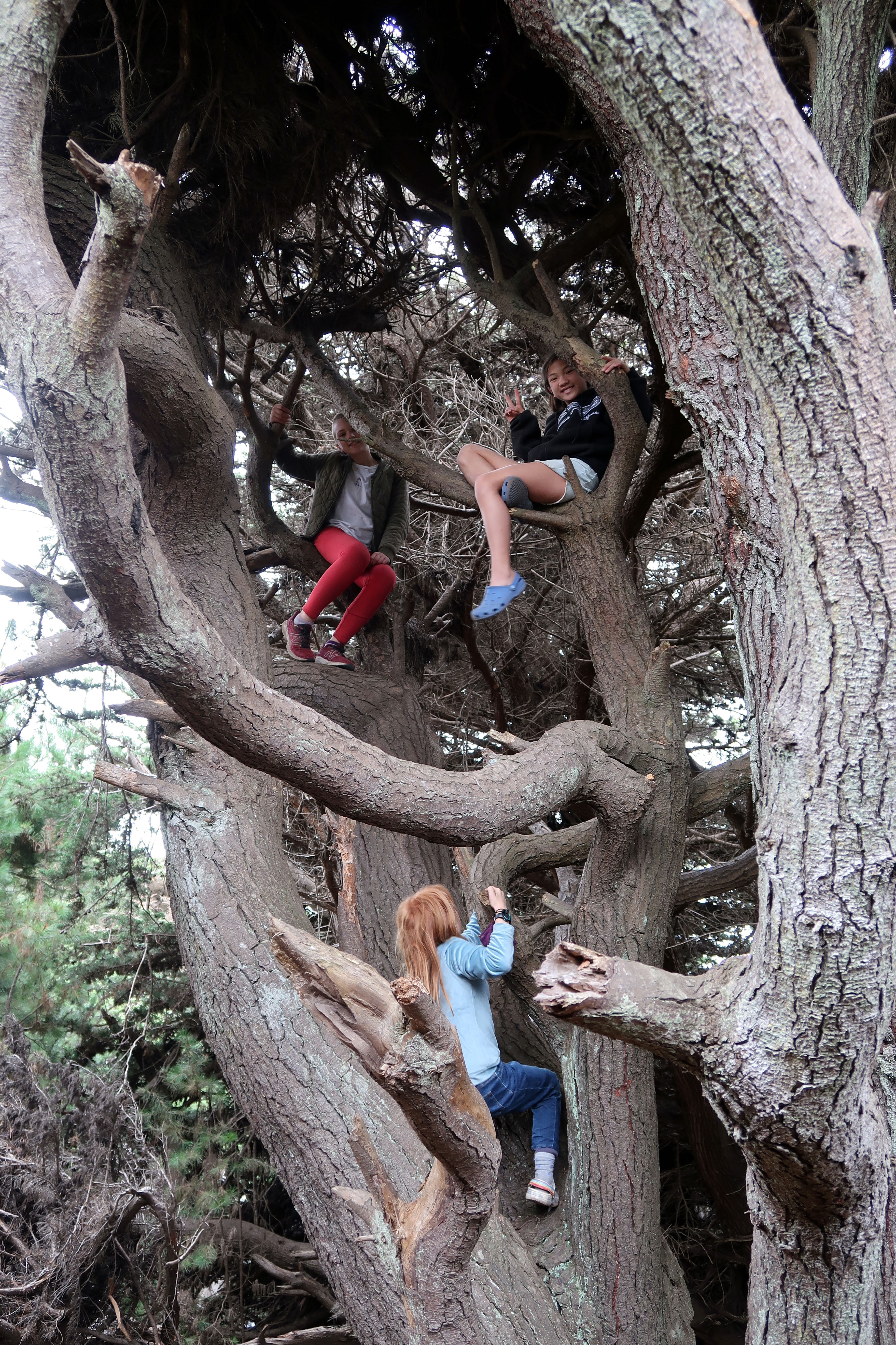 Maggy, Enza, and Josy climbing a tree. 2022-10-02
