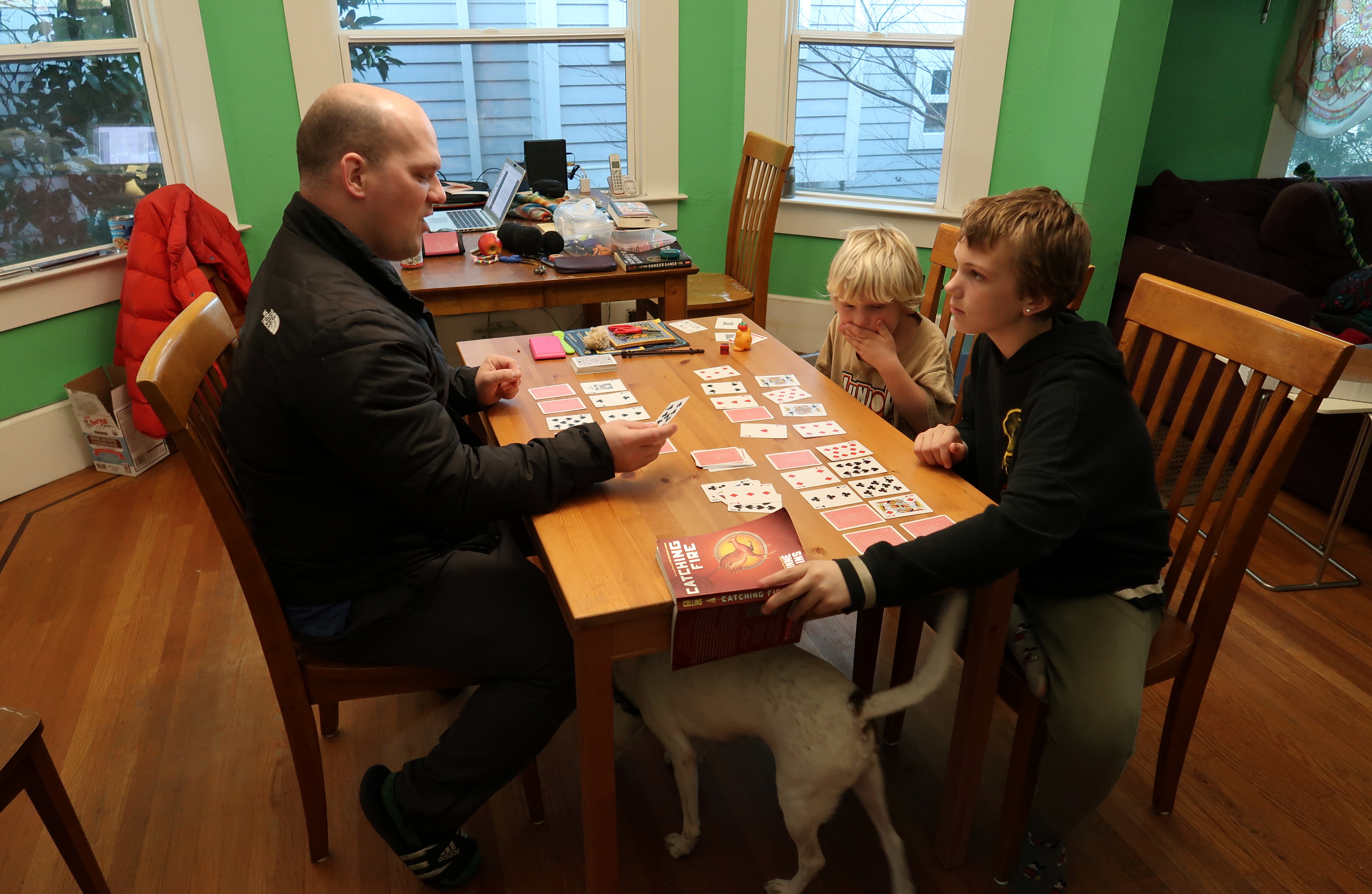 Seva, Leo, and Maggie are playing Garbage. 2023-02-11