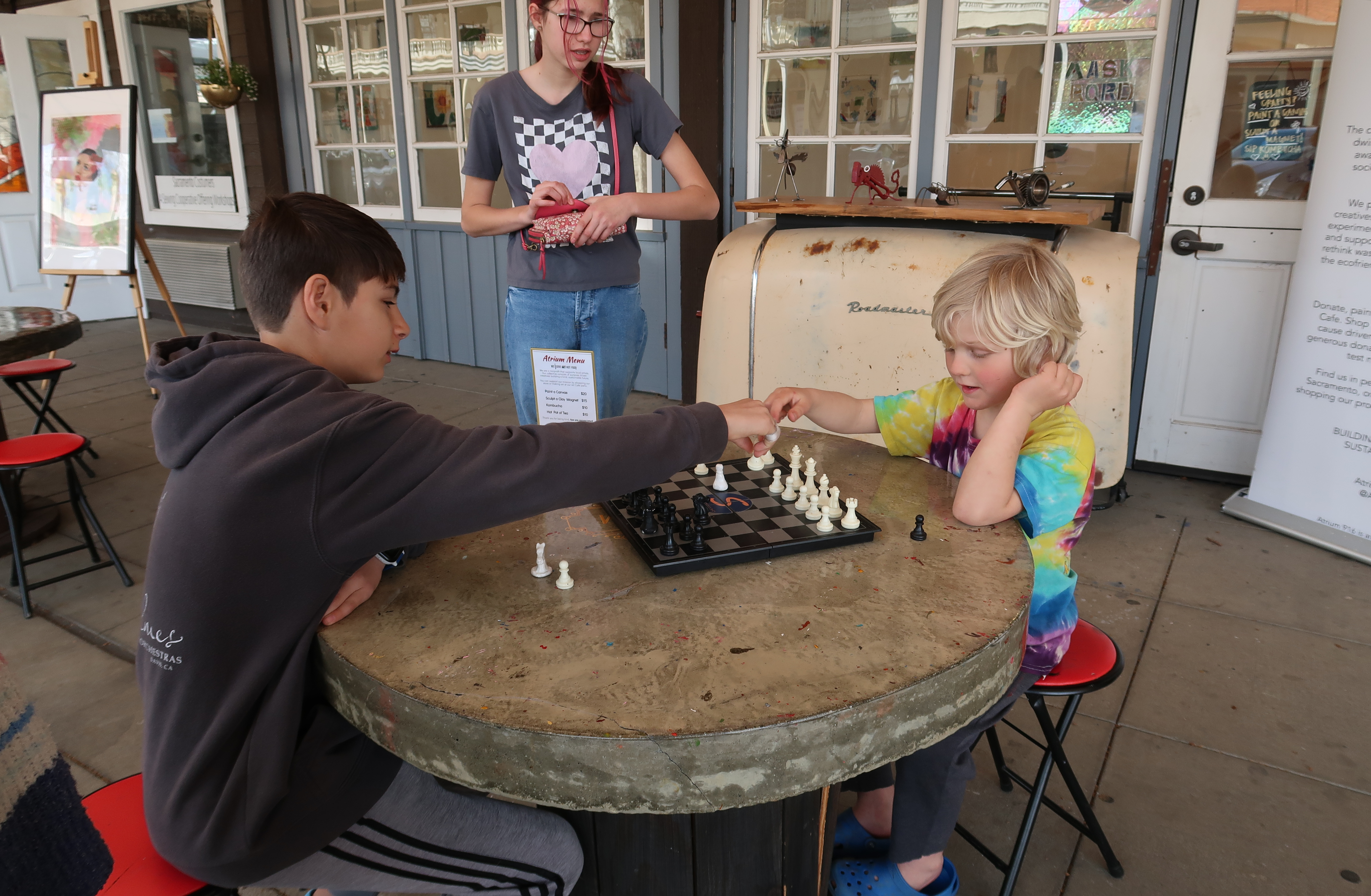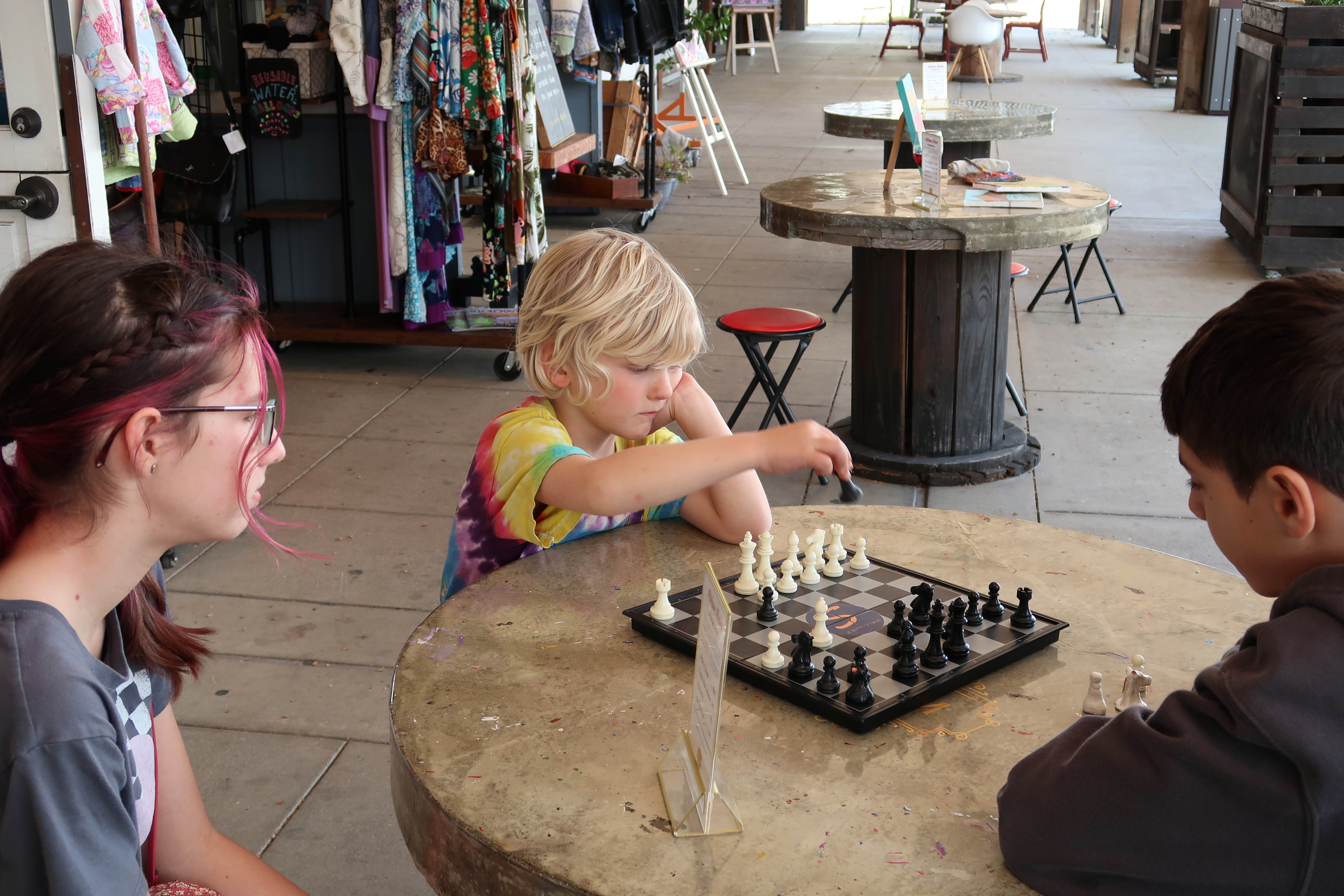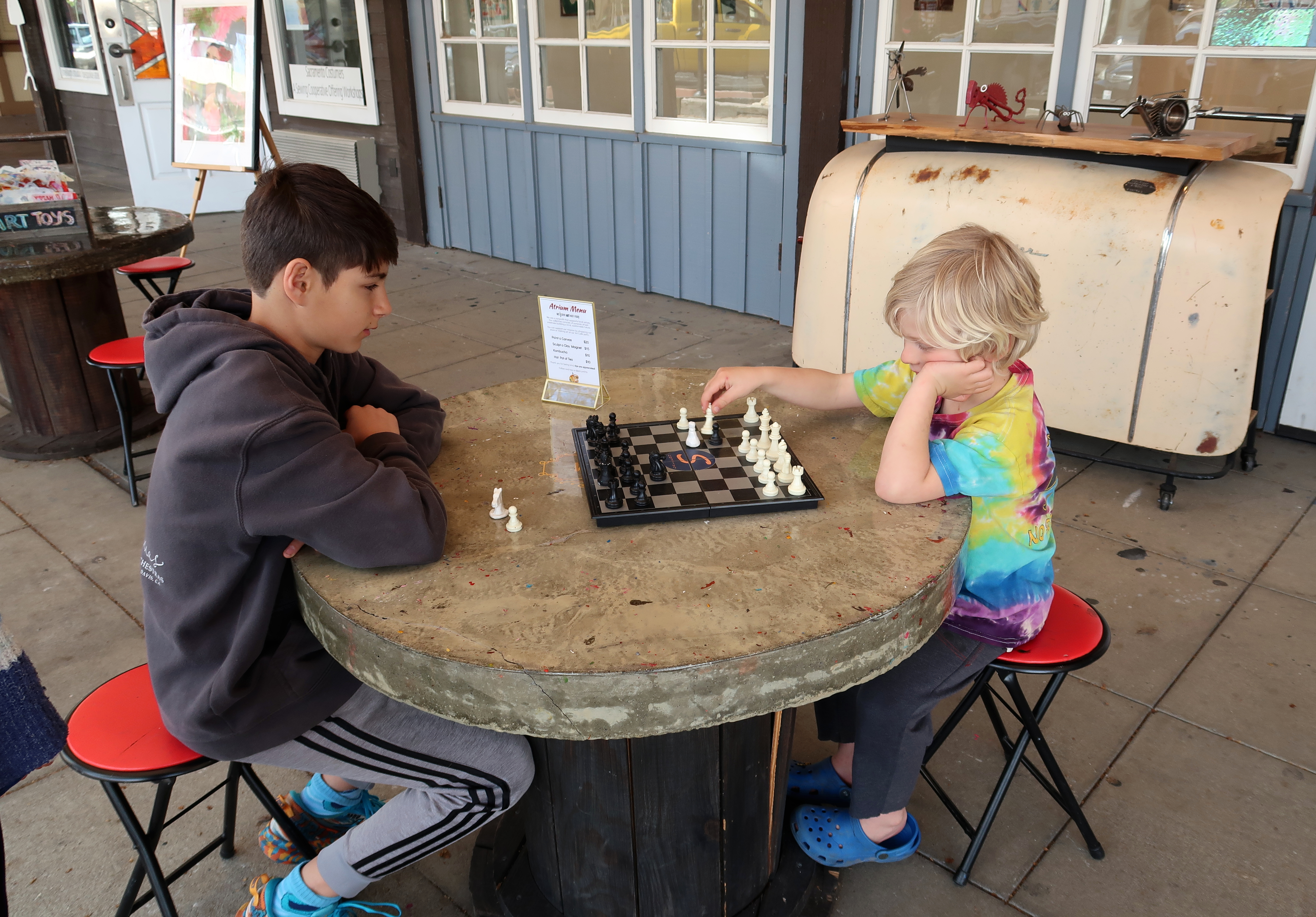 Leo playing chess at the Old Sac mall. 2023-03-31
