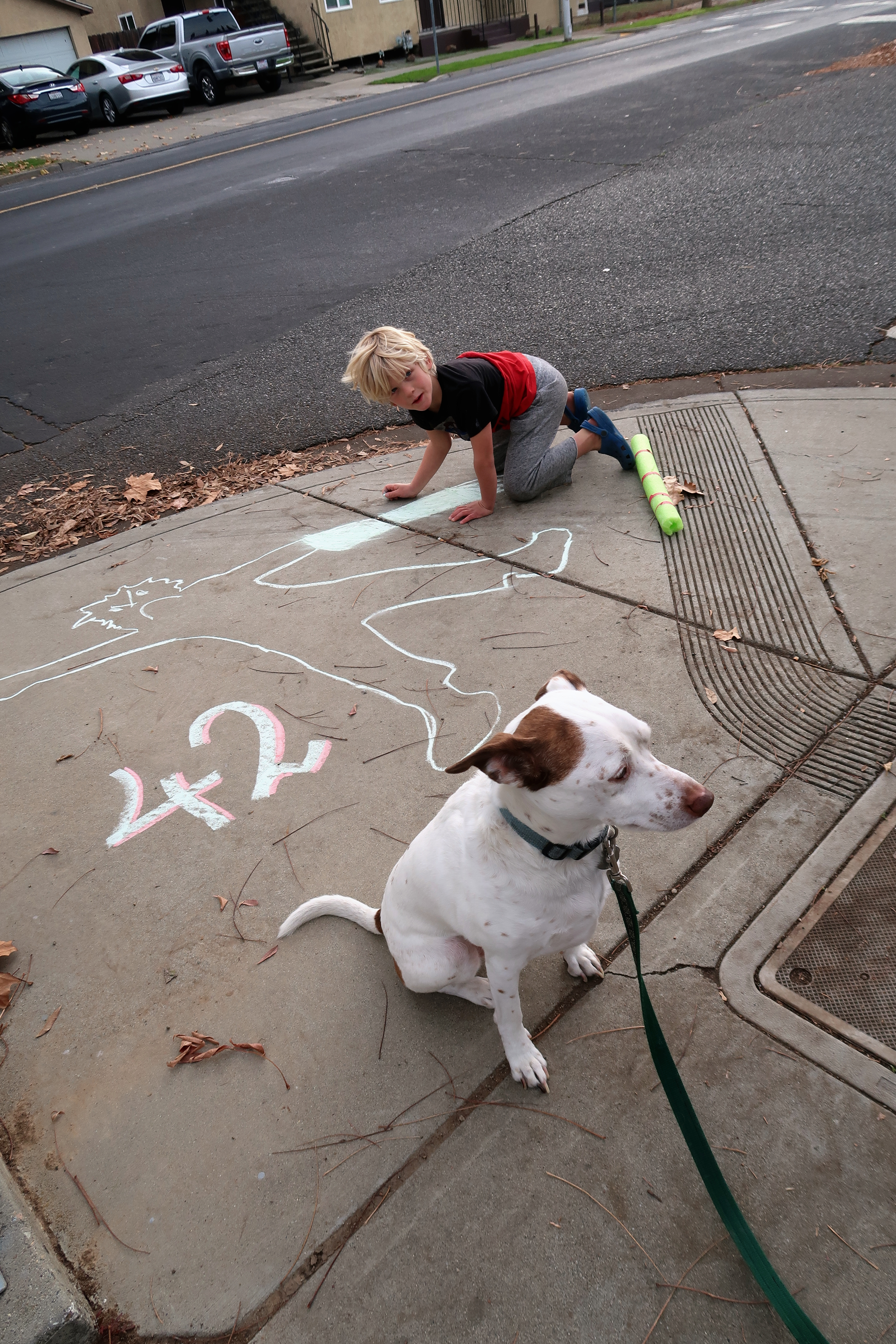 Leo and Cheeta chalking up the sidewalk. 2023-12-17