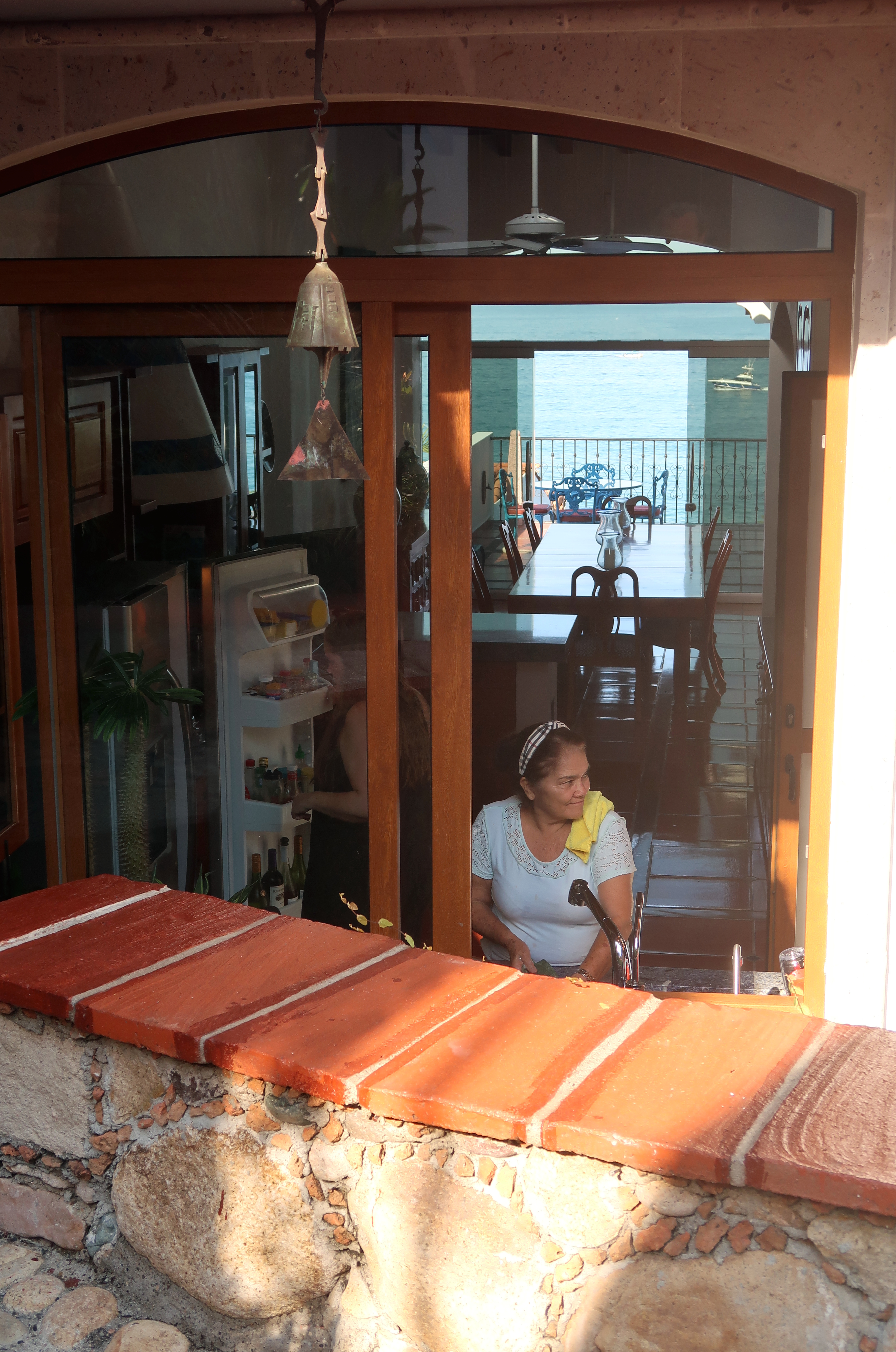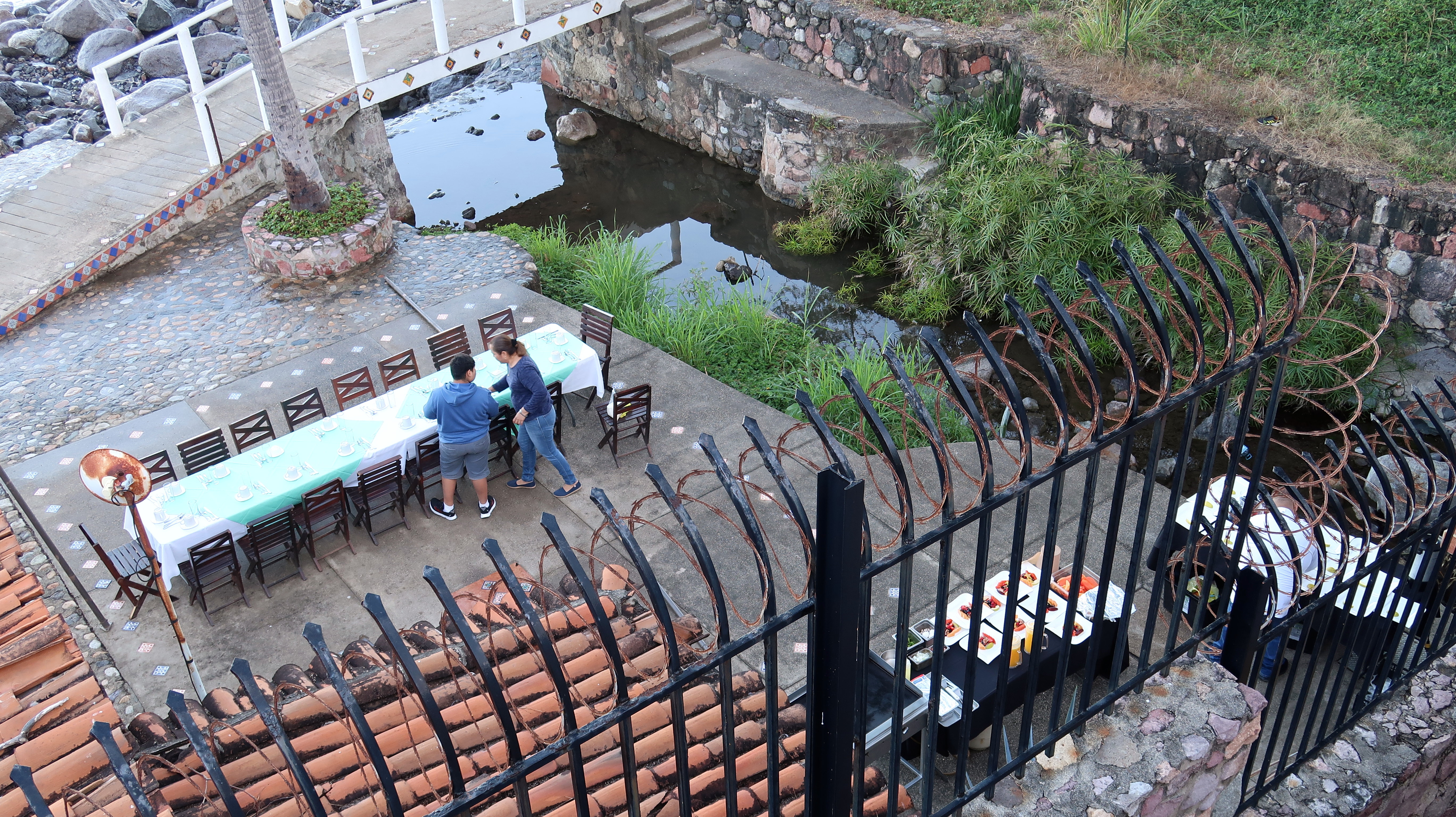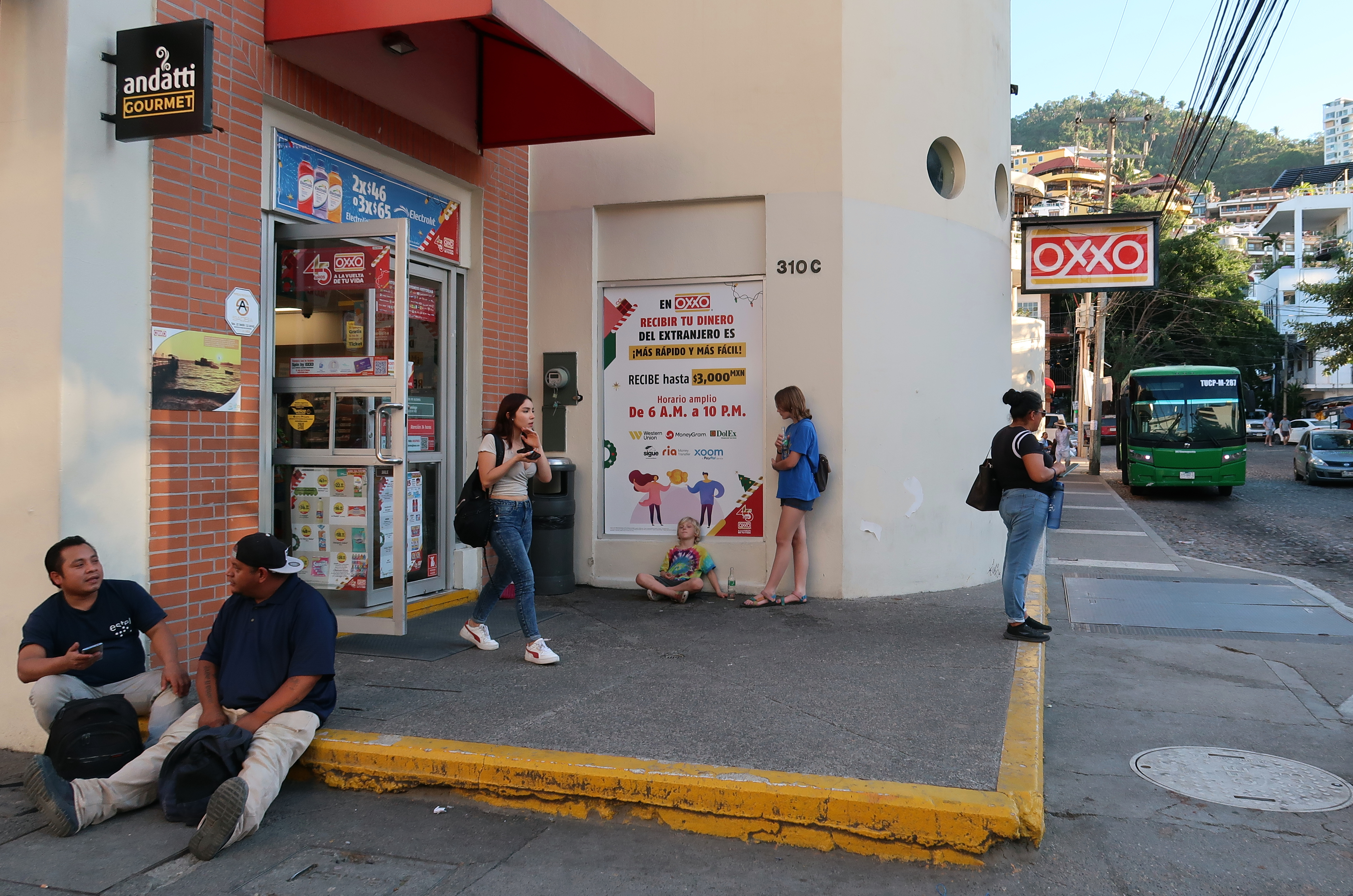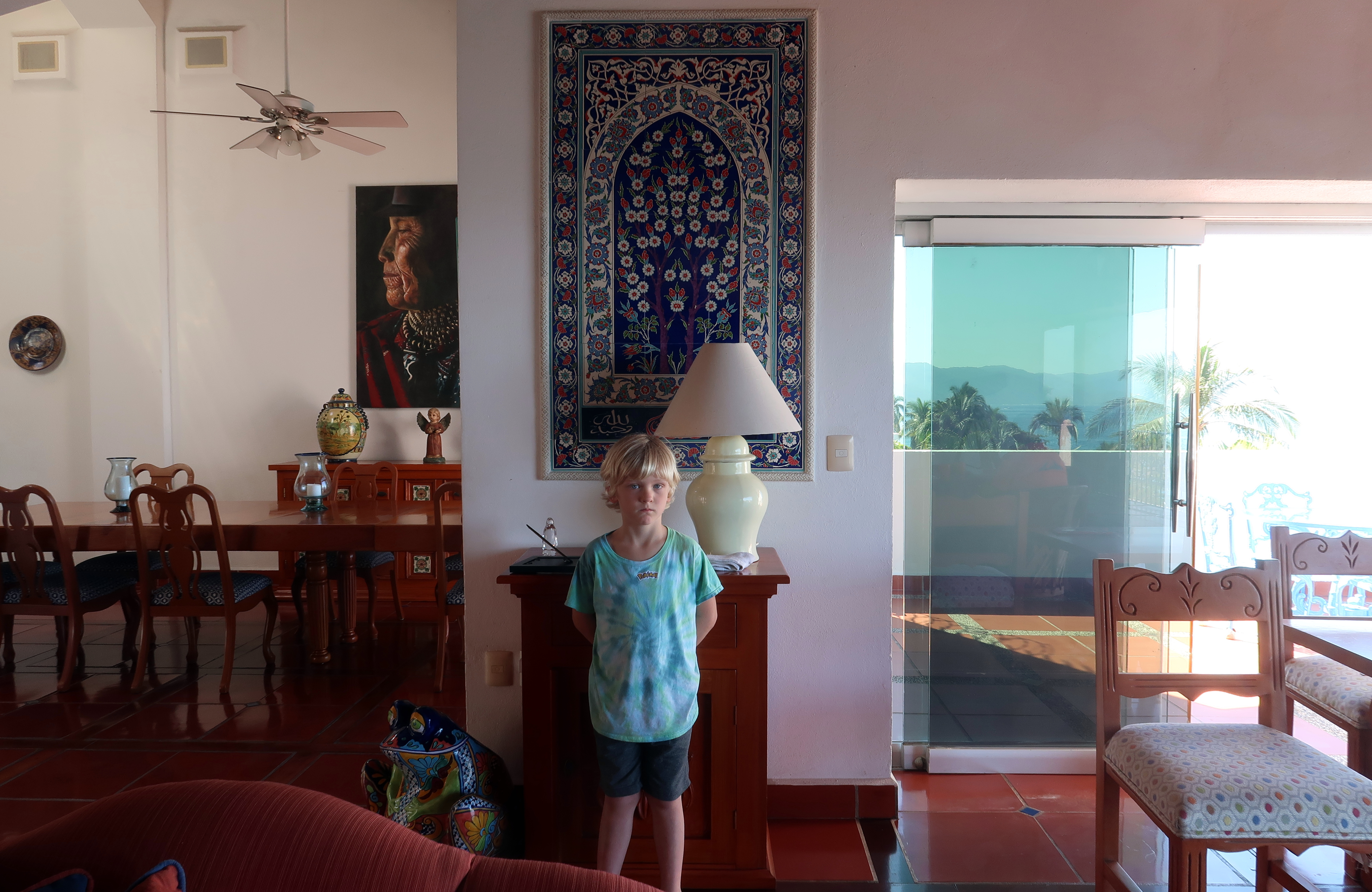 Leo and Maggie at a bus stop in Puerto Vallarta. 2023-12-29