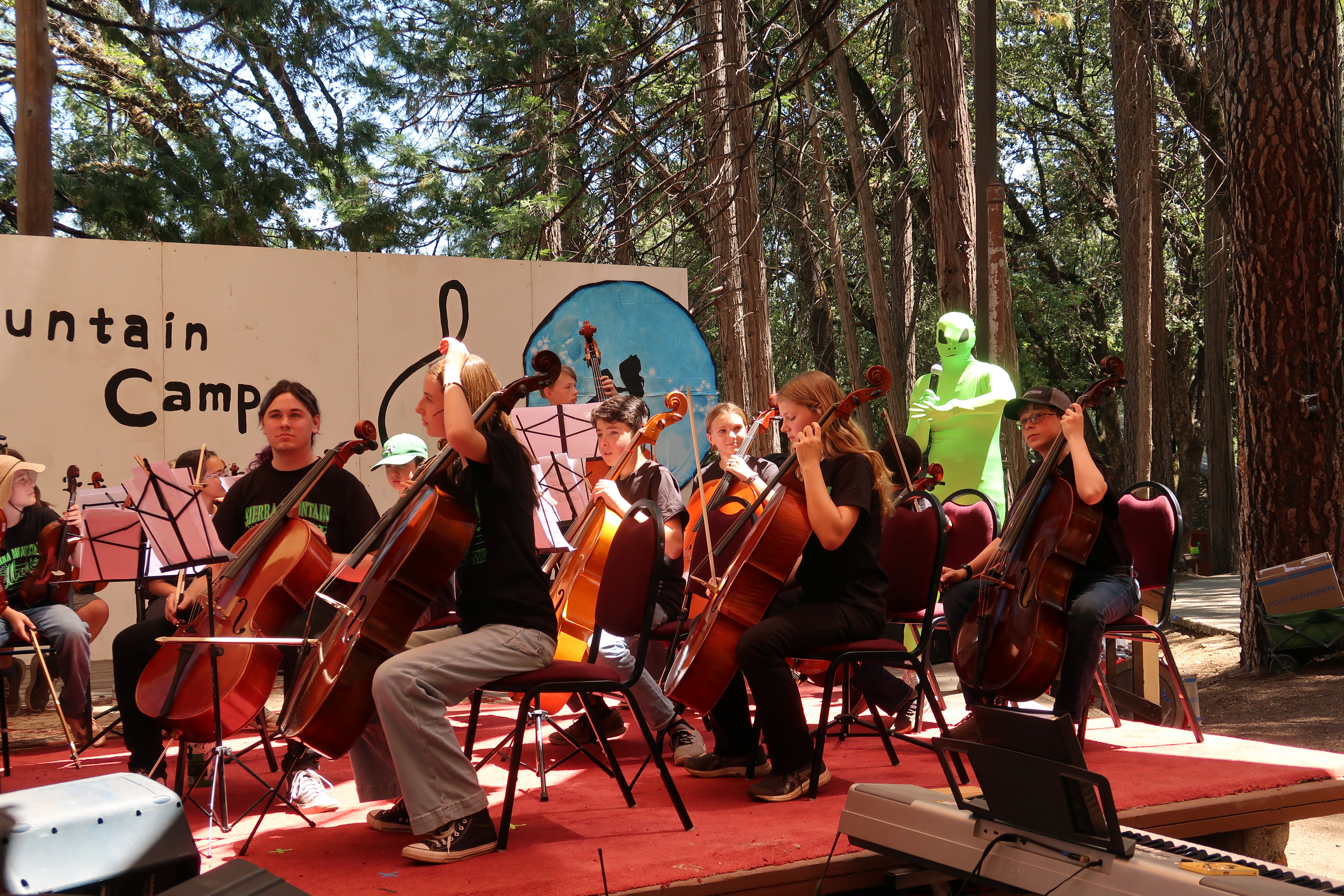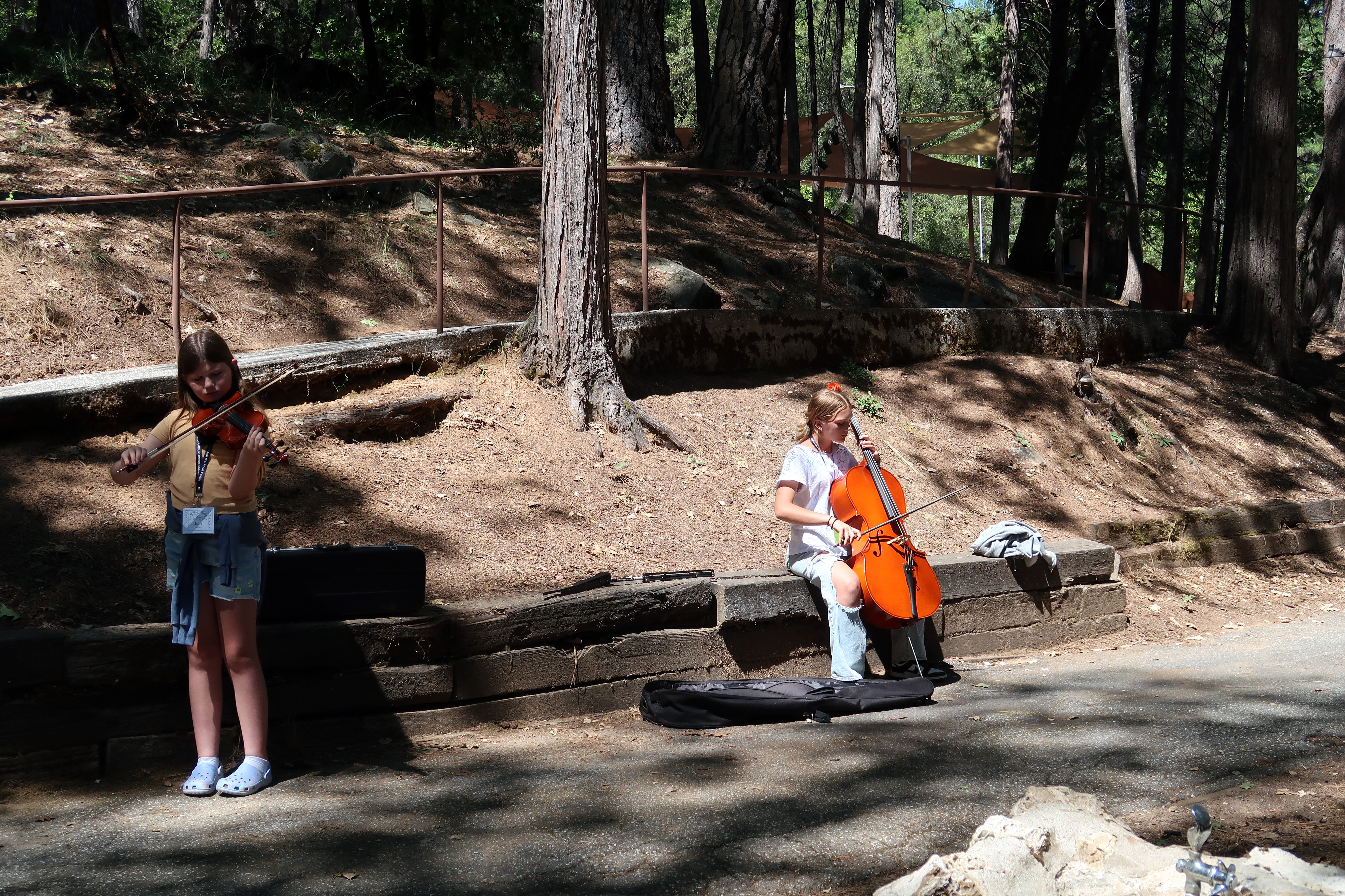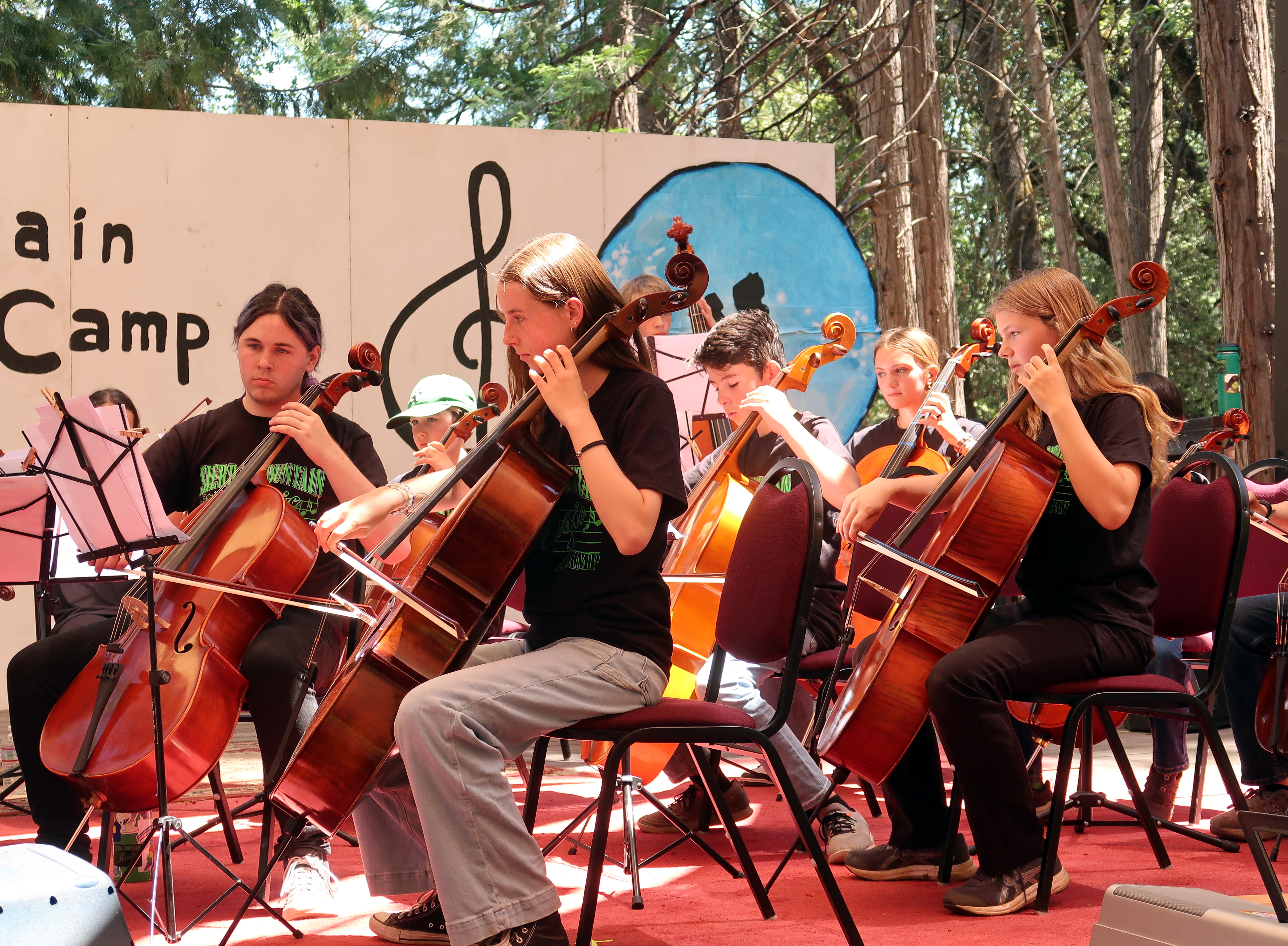 Maggie playing cello at the concert, Sierra Mountain Music Camp. 2024-06-22