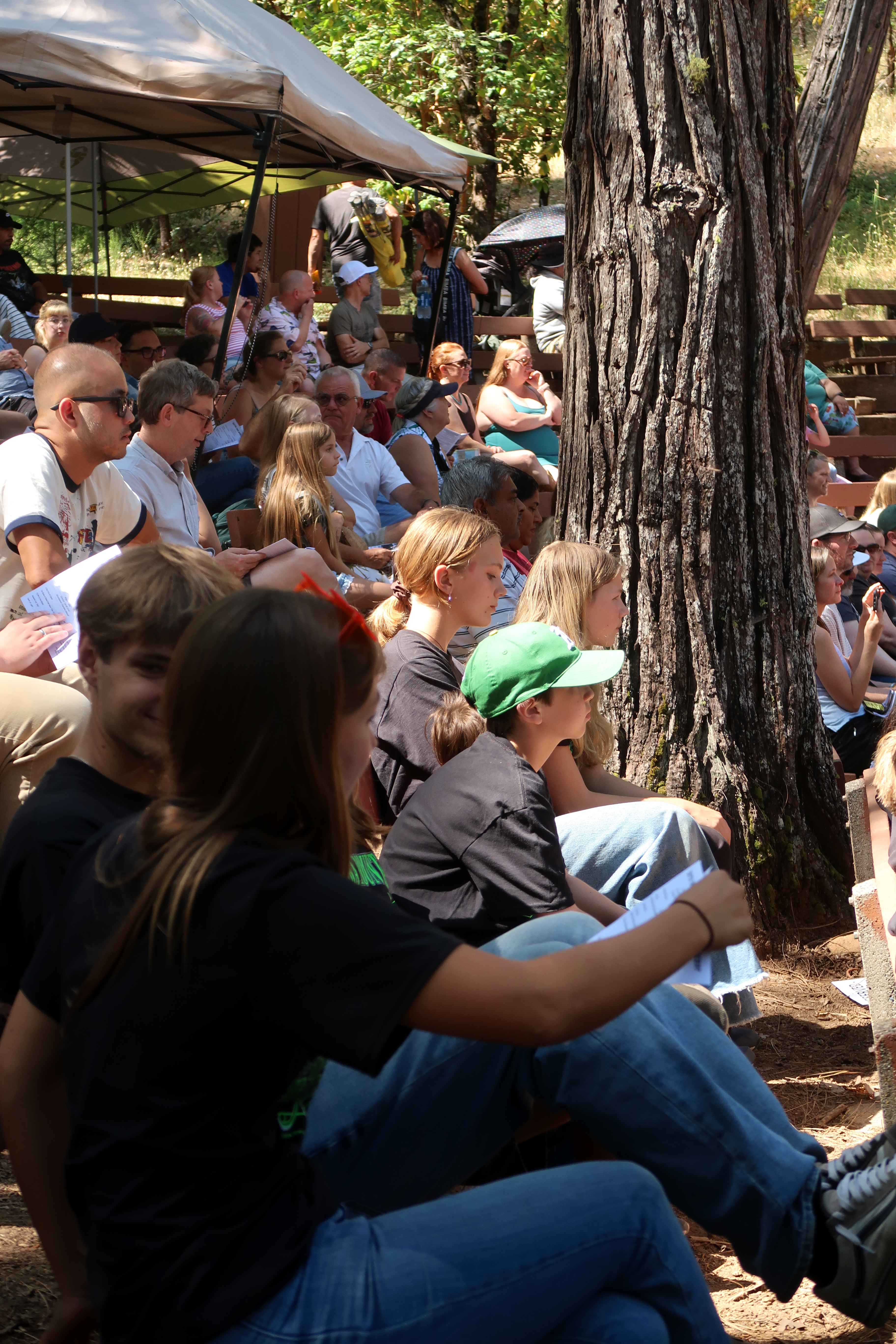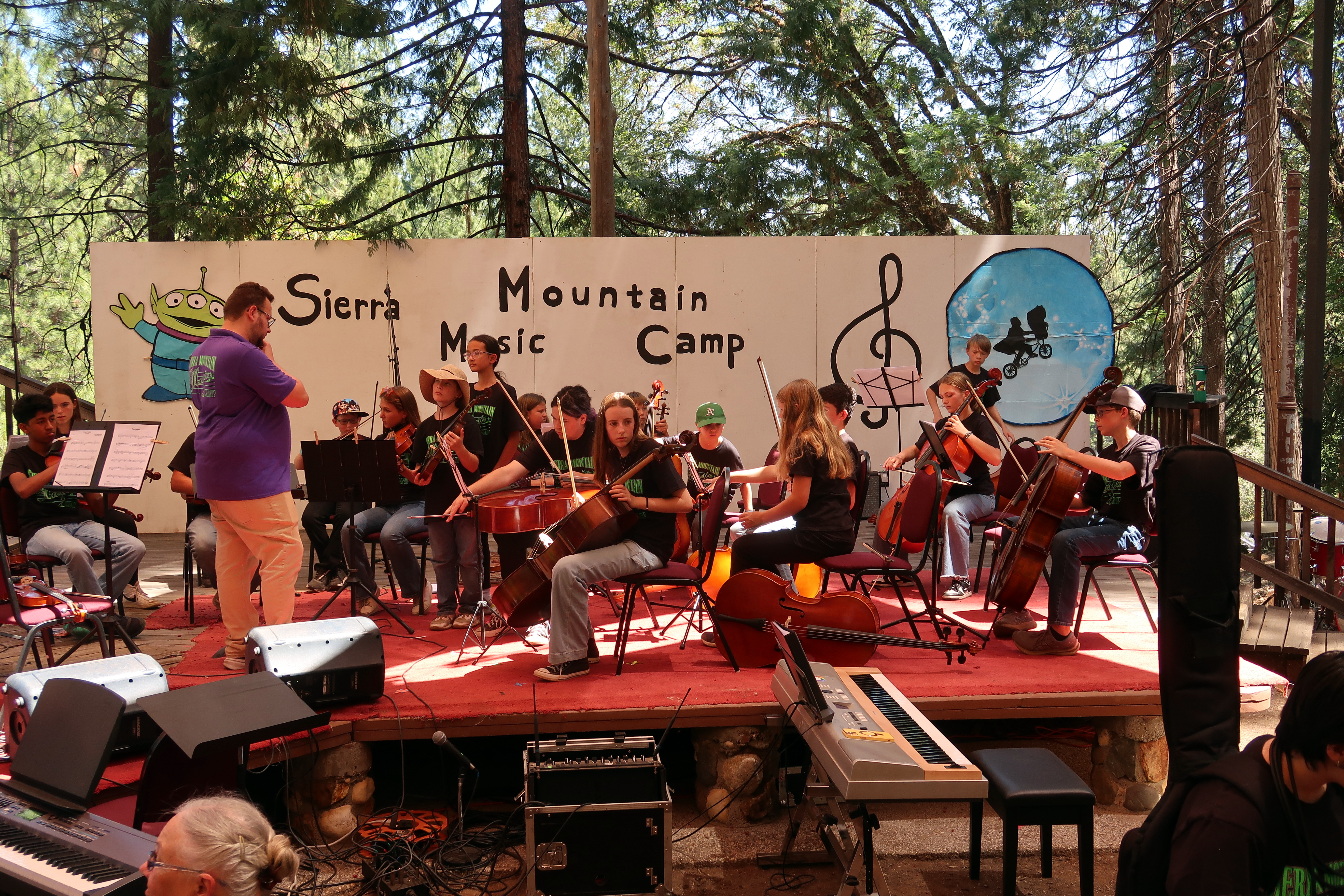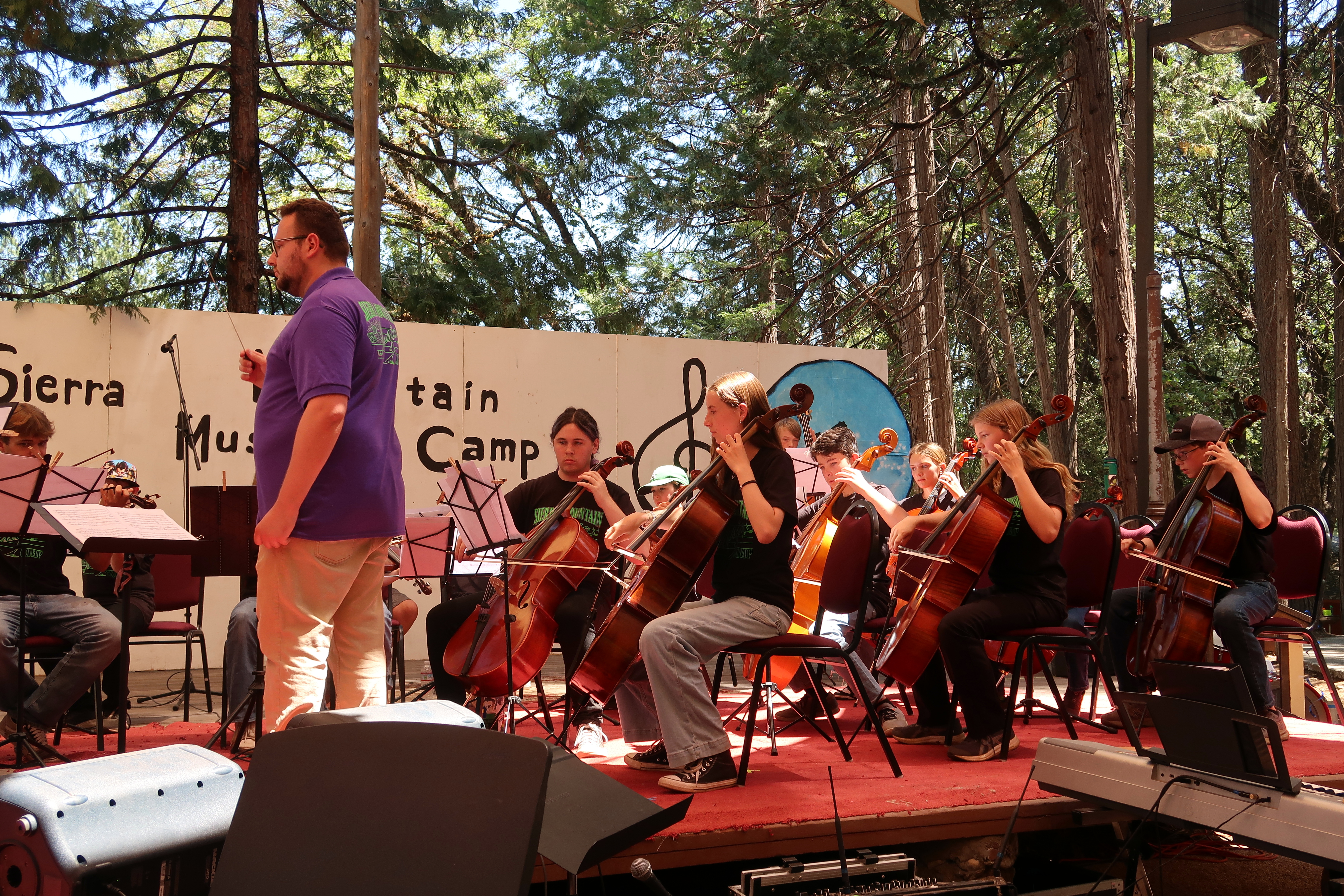 Maggie playing cello at the concert, Sierra Mountain Music Camp. 2024-06-22